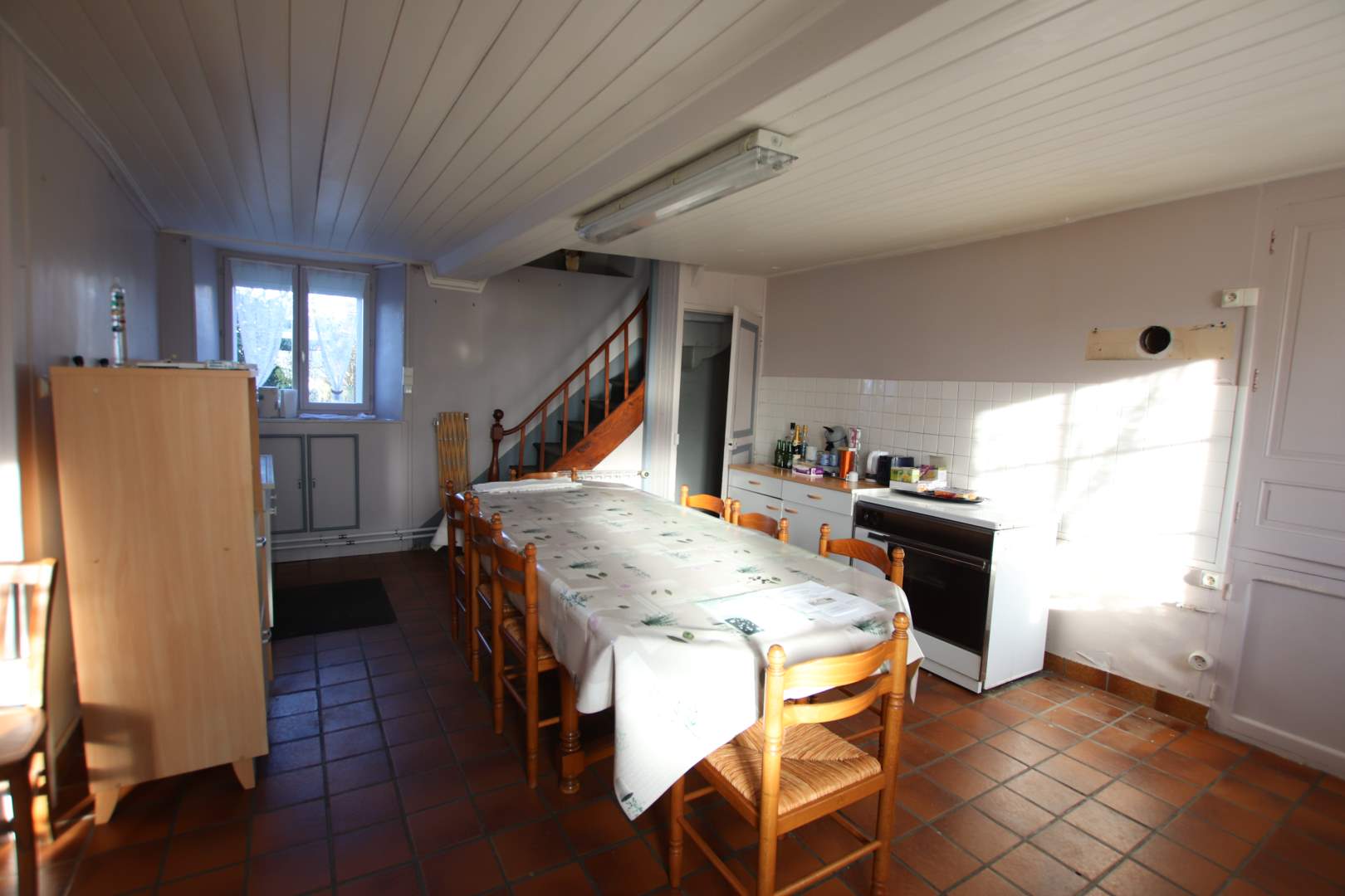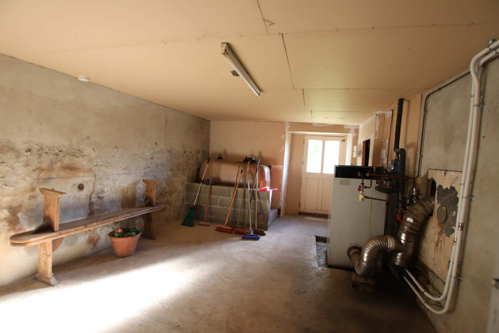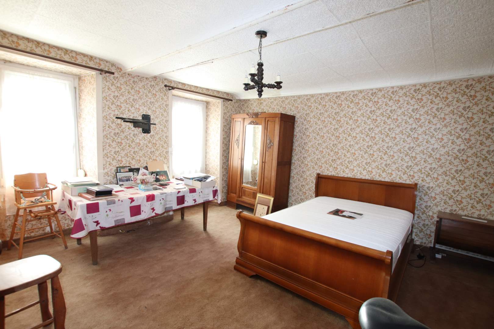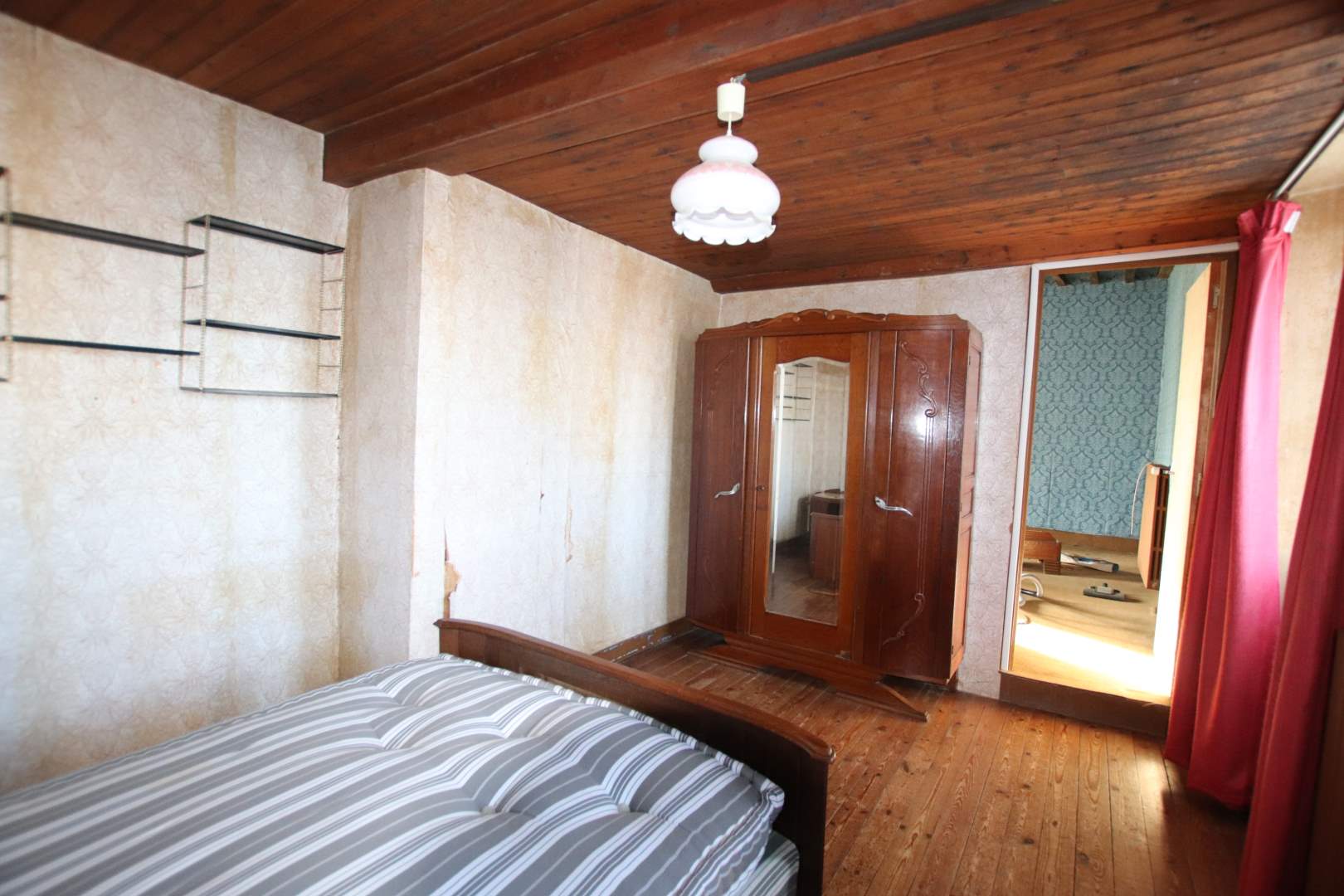Une maison composée : RDC, entrée dans cuisine, salon, salle d'eau avec WC, arrière-cuisine/chaufferie, à l'étage, 1 chambre, 2 chambres communicantes. A la suite, ancienne maison à rénover de 3 pièces. En continuité, une grange, une ancienne écurie. Cour devant. Charreterie à l'arrière et terrain.