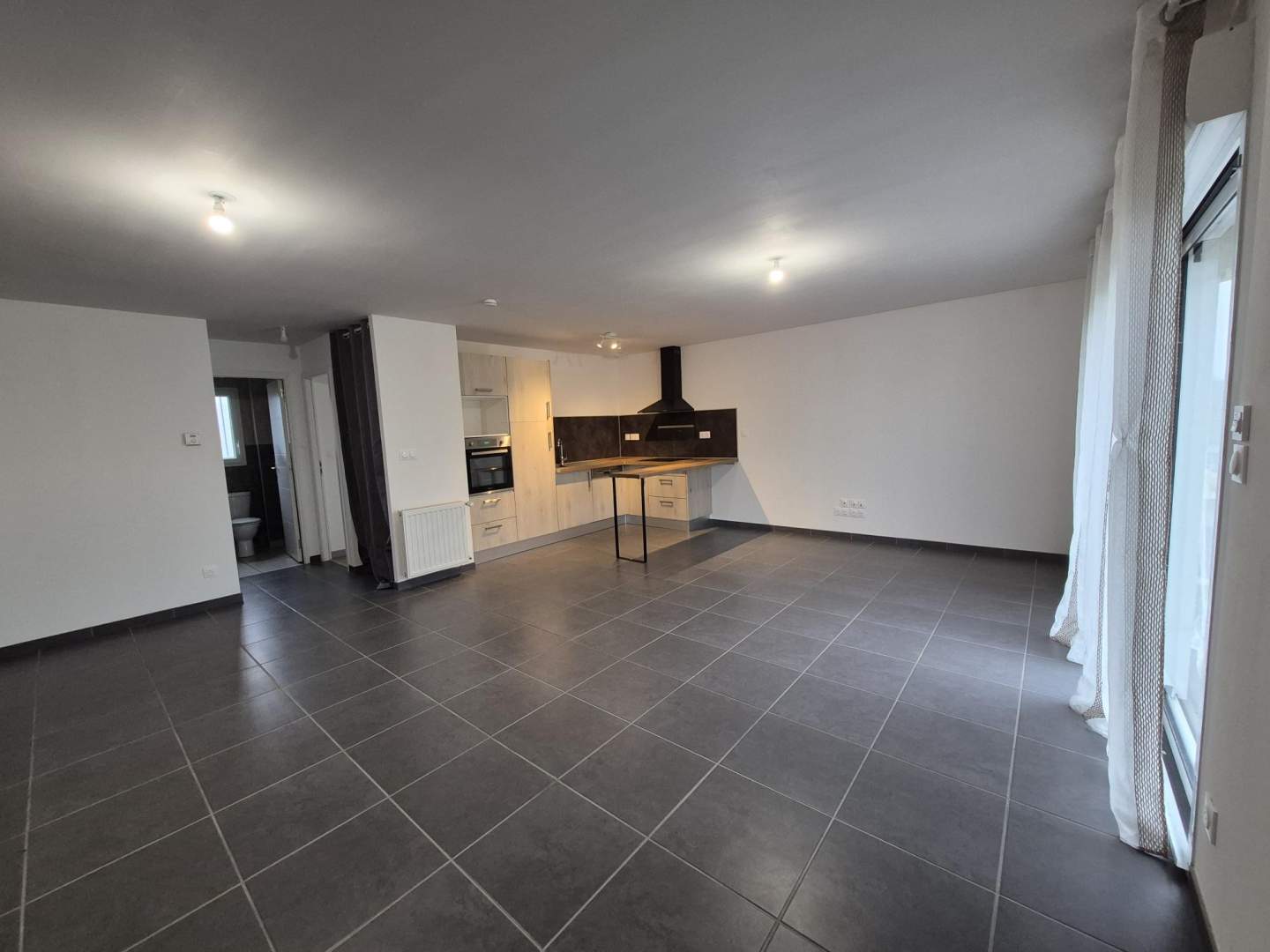 -séjour-salon ouvert sur cuisine améanagée et équipée, 2 chambres avec dressing, salle d'eau, wc. Garage avec porte métallique.