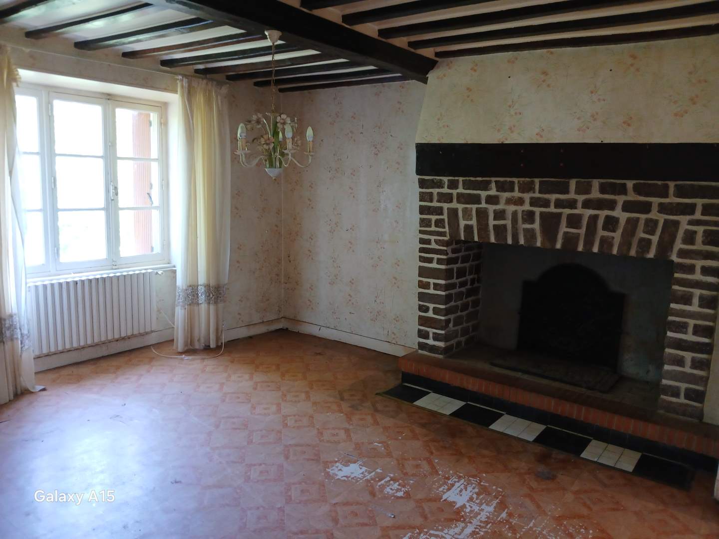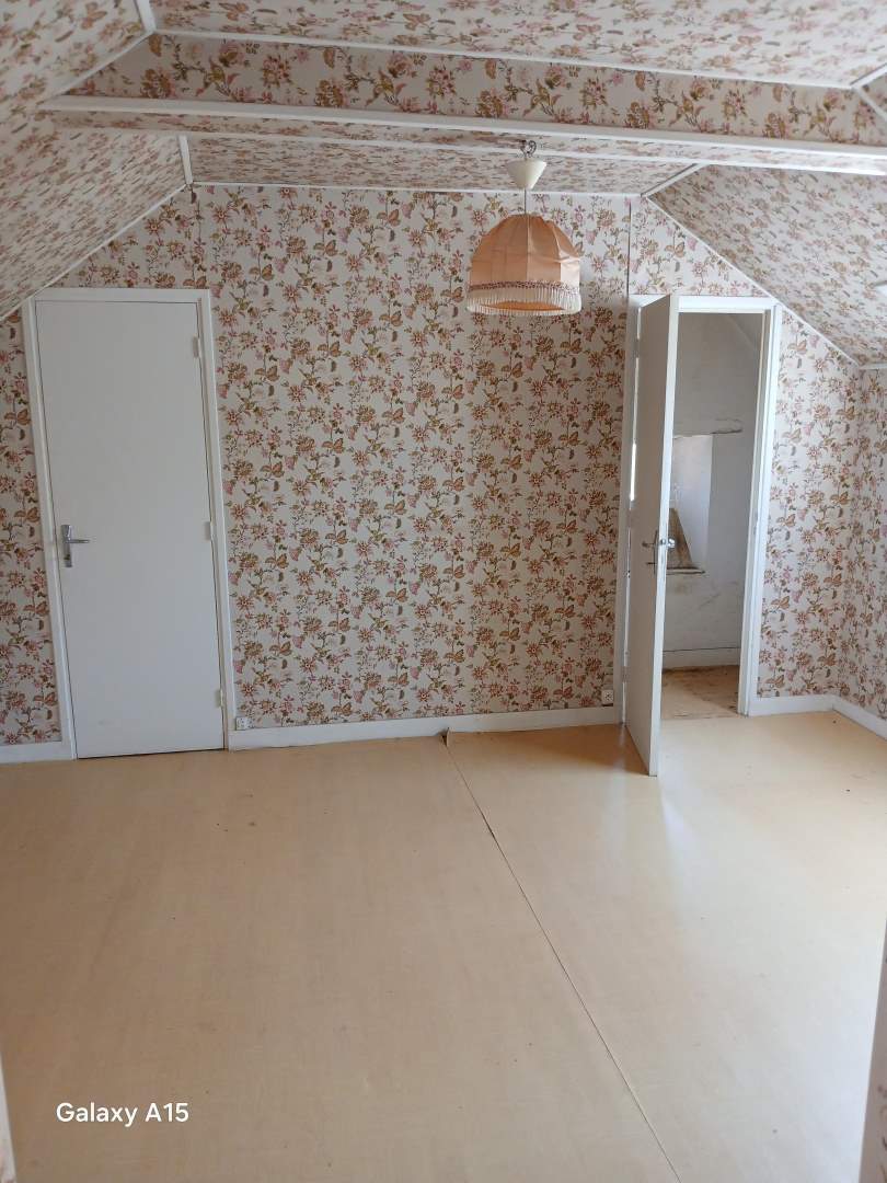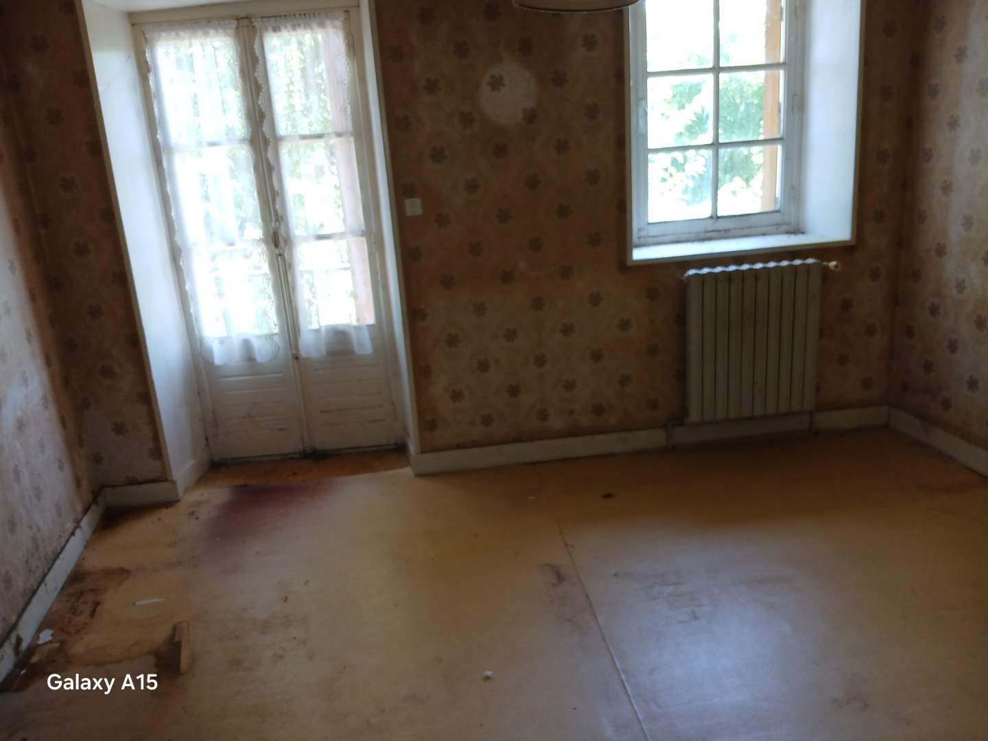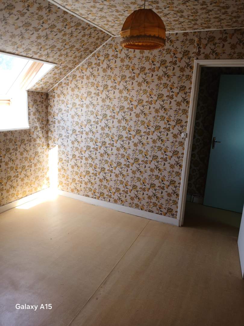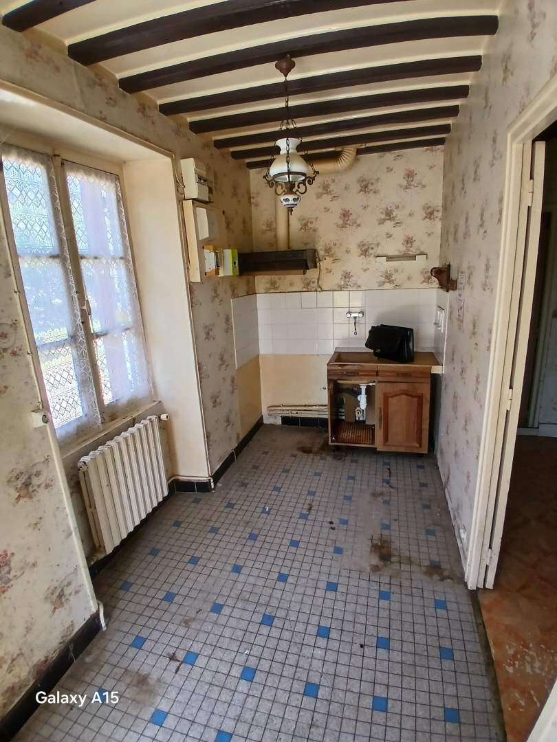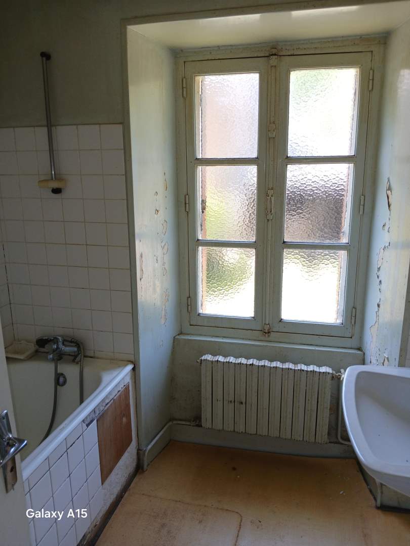 Cuisine, salle à manger avec cheminée à foyer ouvert, dégagement, une chambre, salle de bains, wc.
