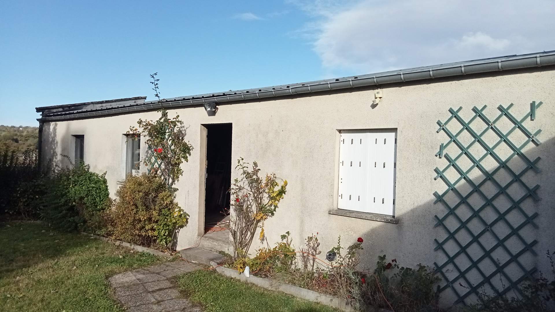 En rez de jardin, une véranda, une cuisine, caves, une chambre, une salle de douche, un wc, pièces à finir.