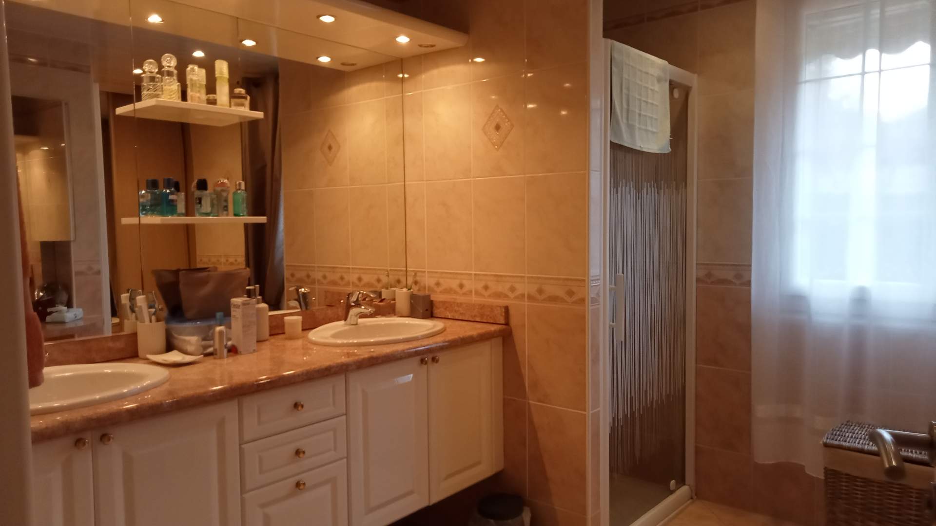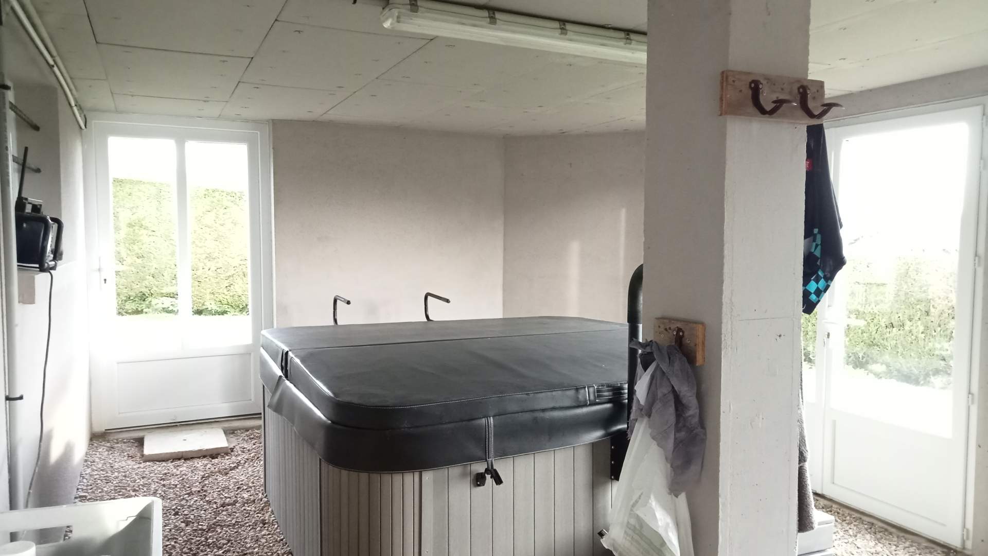 Sous-sol complet : garage, chaufferie, cave, cuisine avec cabine de douche, pièces.