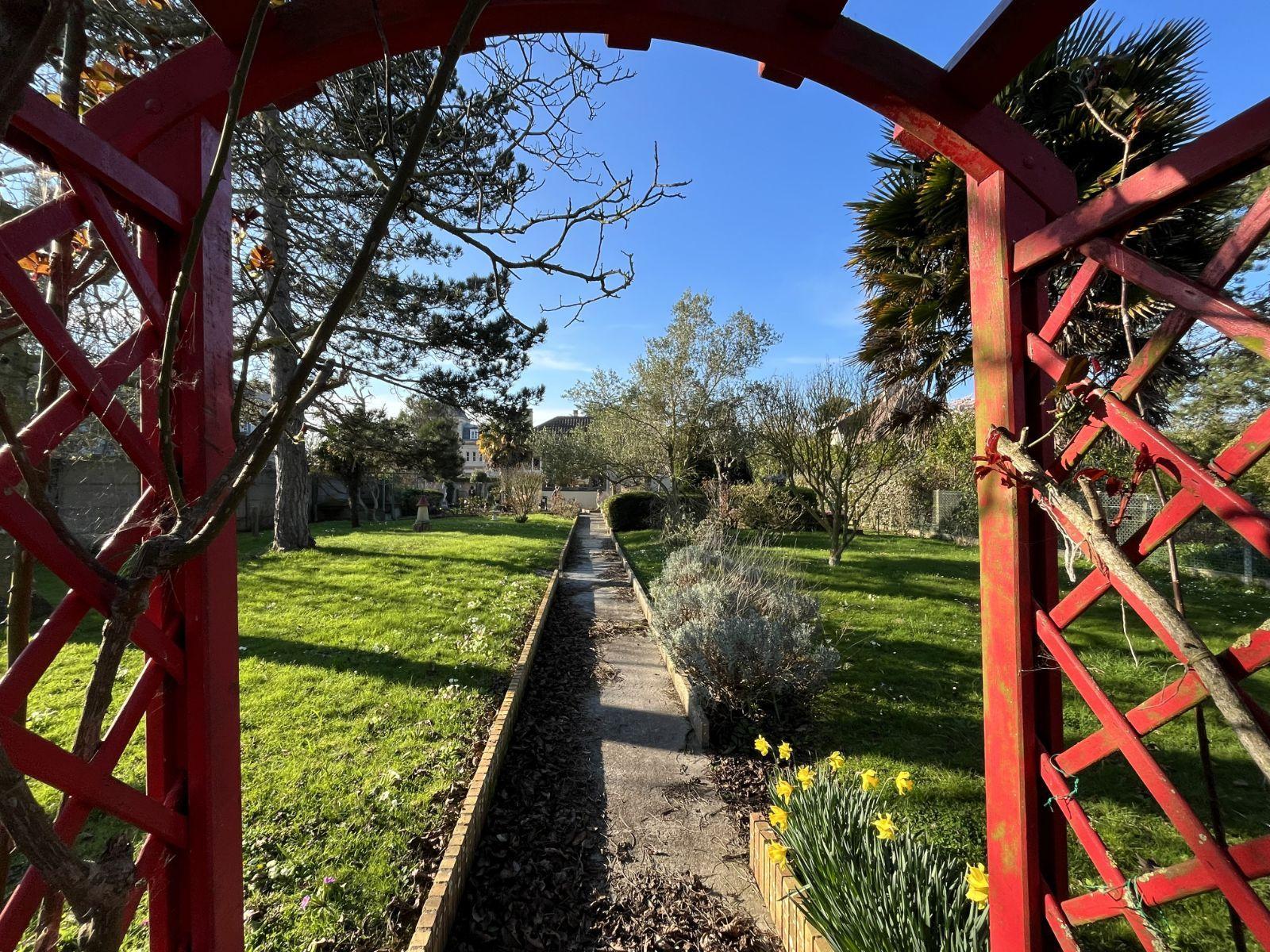 Charmant jardin arboré avec barbecue.
