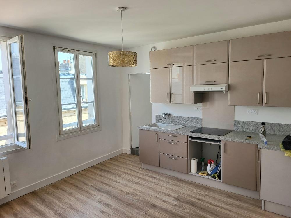 Proche Place des Anciennes BoucheriesCoup de cœur pour ce bel appt F2, refait à neuf, situé au 3ème étage sans ascenseur, comprenant séjour parqueté avec cuisine US aménagée et équipée (plaque de cuisson et hotte), grande chb parquetée, sd'eau avec wc.Huisseries PVC double vitrage.