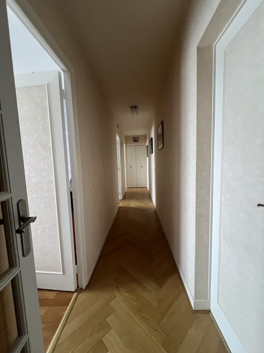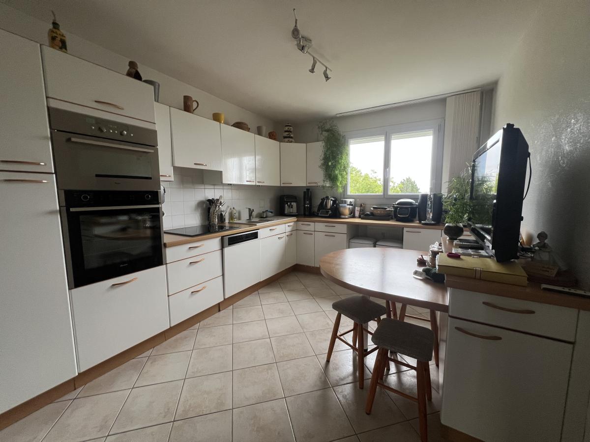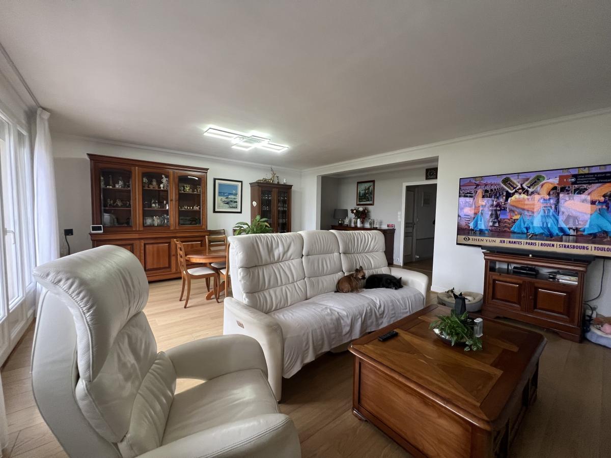 CAEN rive gauche - Résidence Jean Racine - dans résidence de bonne tenue avec ascenseur, beau 5 pièces de 119 m2, comprenant séjour salon 37 m2, cuisine aménagée, 3 chambres, 2 salles d’eau, wc. Cave et garage. Balcon. Charges collectives gaz. (Bientôt chauffage urbain). Très bon état général. DPE : C