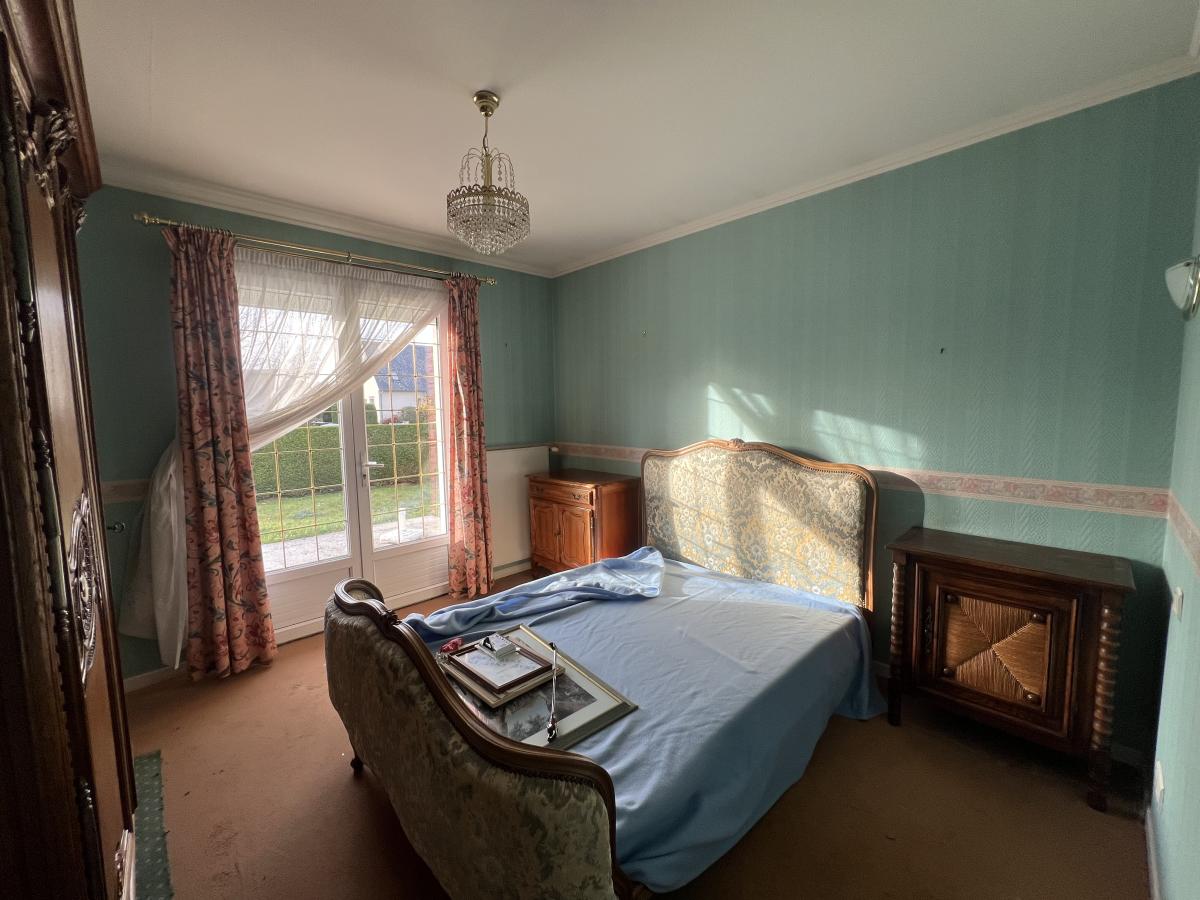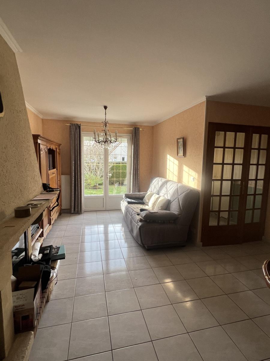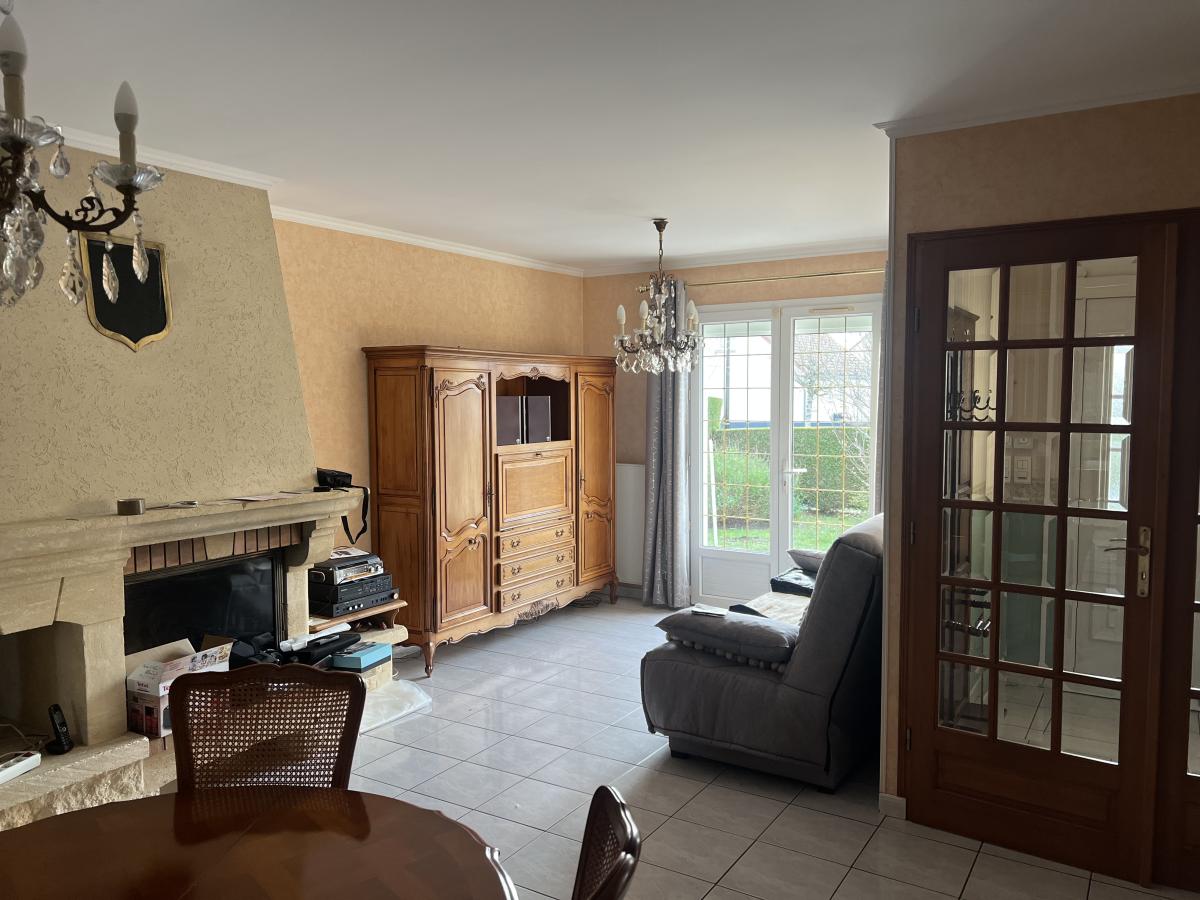 OUEST DE CAEN - CARPIQUET - bus de ville - Maison individuelle 1998 de plain pied sur sous sol complet comprenant entrée, séjour salon avec cheminée, cuisine aménagée, 3 chambres, salle d'eau récente, wc avec lave mains, dégagement. Chauffage gaz. Fenêtres PVC avec volets roulants électrique. Terrain clos de 610 m2 avec cabanon. DPE : D