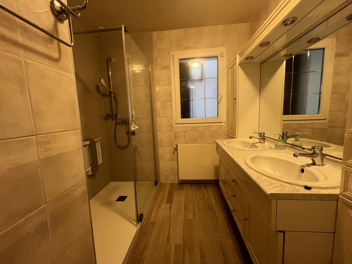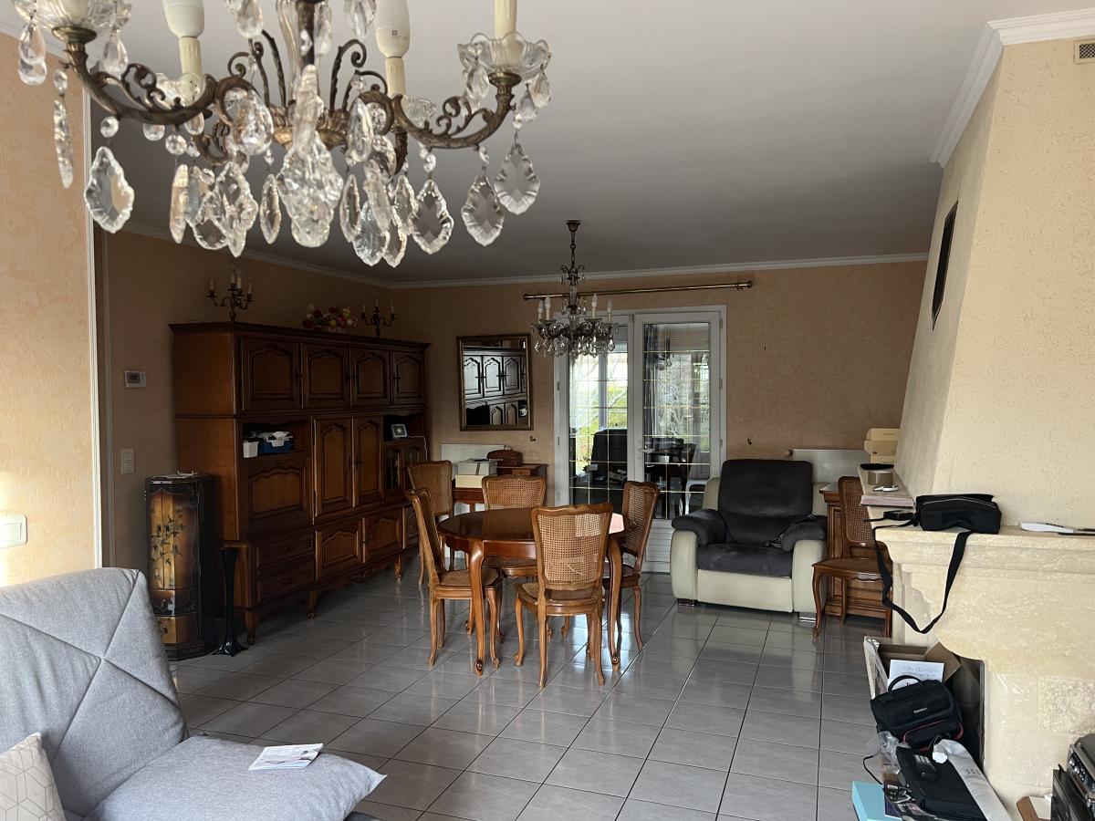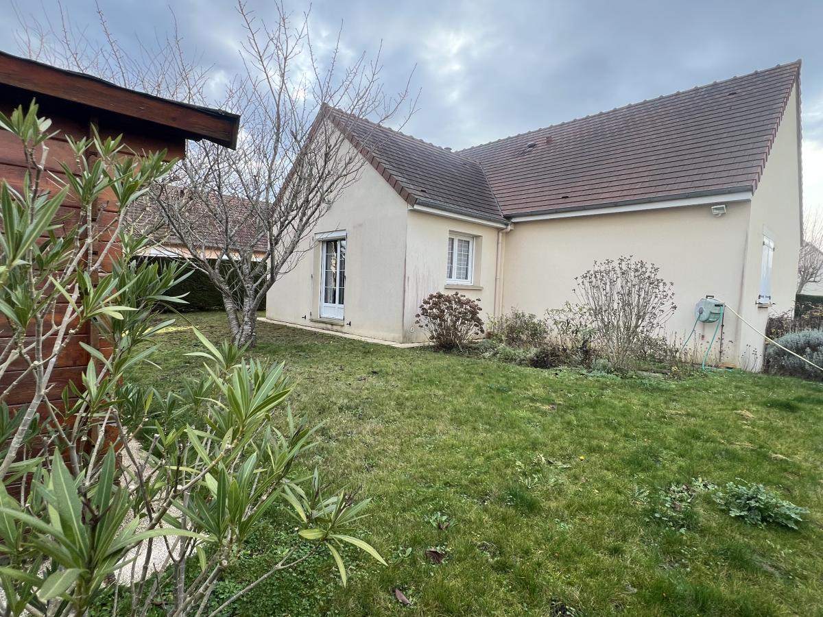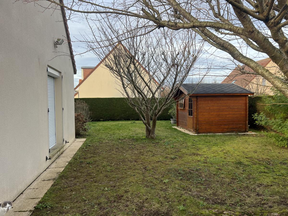 OUEST DE CAEN - CARPIQUET - bus de ville - Maison individuelle 1998 de plain pied sur sous sol complet comprenant entrée, séjour salon avec cheminée, cuisine aménagée, 3 chambres, salle d'eau récente, wc avec lave mains, dégagement. Chauffage gaz. Fenêtres PVC avec volets roulants électrique. Terrain clos de 610 m2 avec cabanon. DPE : D