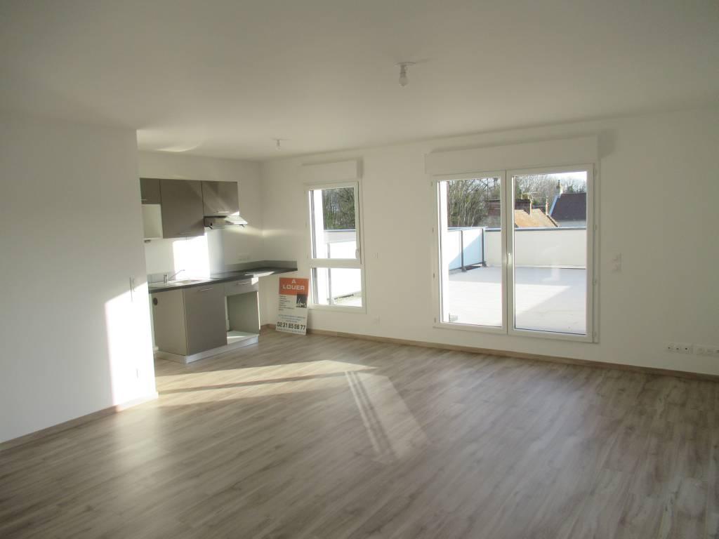 Libre le 13 mars 2026, Appartement de 4 pièces principales avec grande terrasse et balcons, comprenant entrée, cuisine ouverte sur séjour salon, 3 chambres, salle de bains avec wc, salle d'eau. Place de Parking en sous-sol et à l'extérieur. Loi Pinel. Loyer : 853 € - Prov s/charges : 120 € - Dépôt de garantie : 853 € - Frais de bail : 698,75 € - Frais d'état des lieux : 135 € - Service Location : 02.31.85.56.77 du lundi au jeudi de 14h à 18h et le vendredi de 14h à 17h