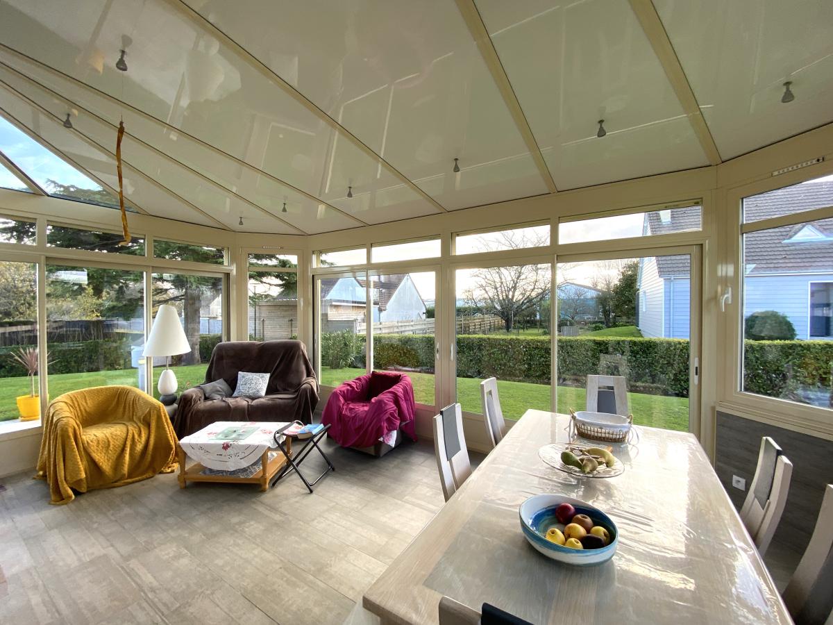 - au rez-de-chaussée : entrée dans vaste séjour-salon avec cheminée prolongé par une véranda de qualité chauffée, une cuisine indépendante aménagée et équipée, dégagement, WC, une chambre avec accès terrasse et salle d'eau.