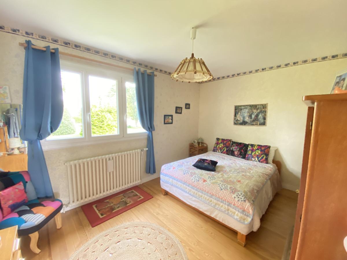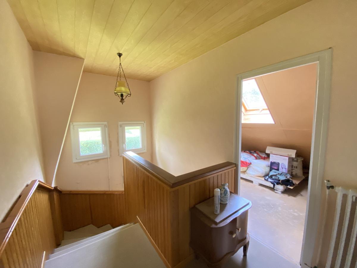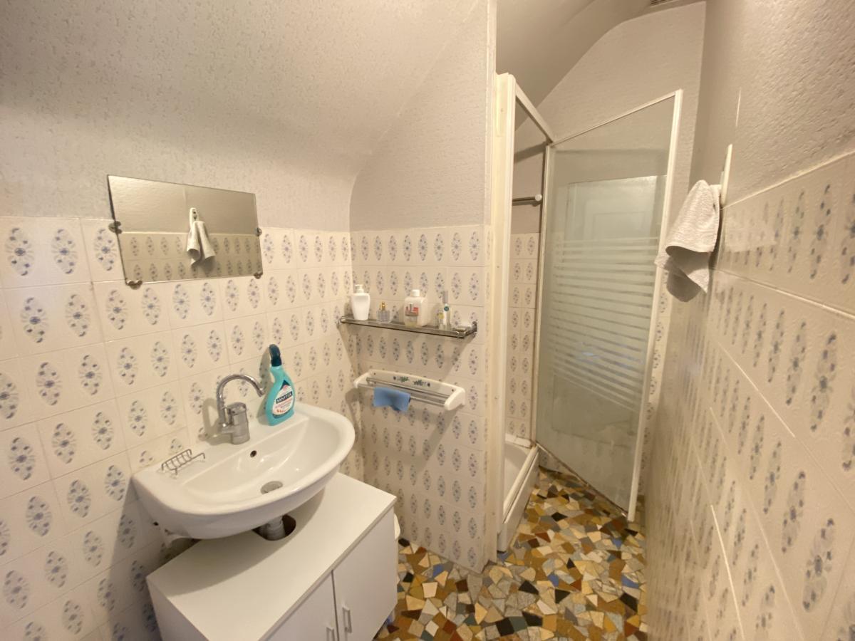A l'étage : palier, deux chambres spacieuses également, un grenier, salle d'eau et WC. Sous-sol complet - Chauffage gaz - Fenêtres PVC - Abri de jardin.