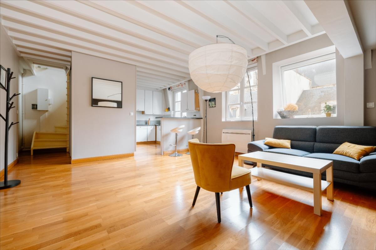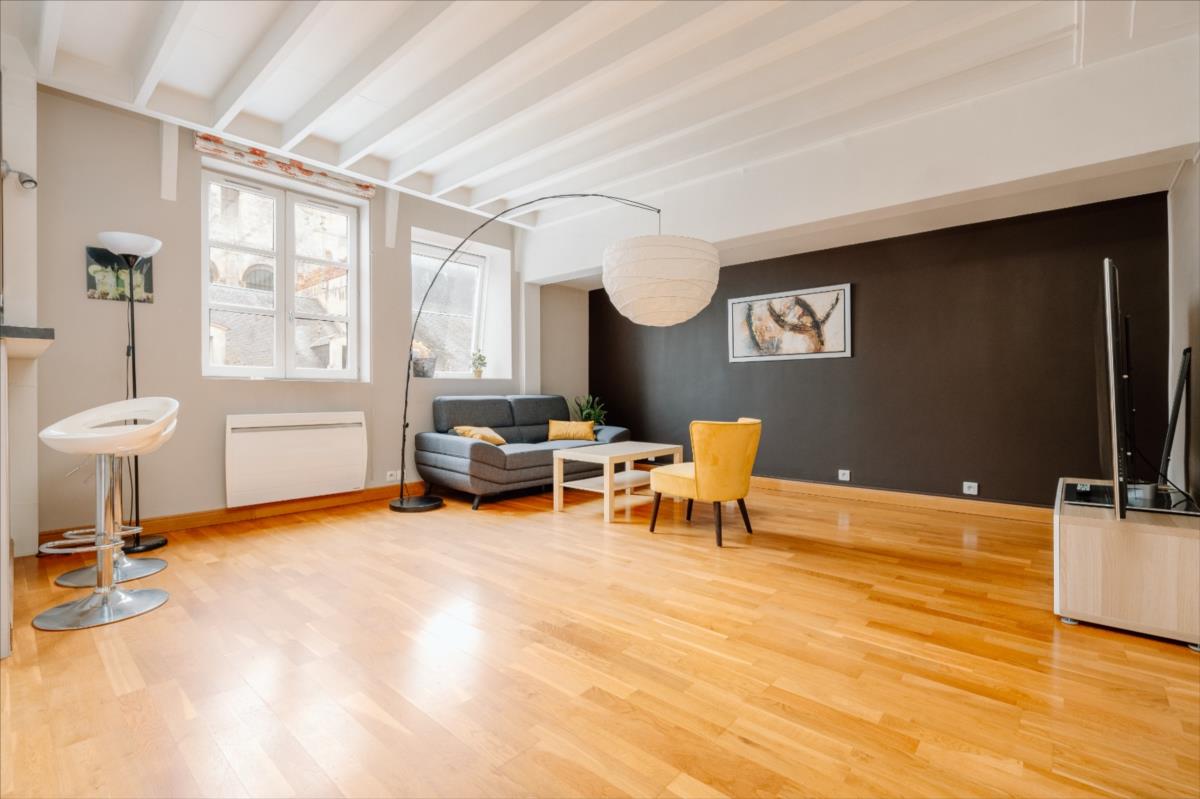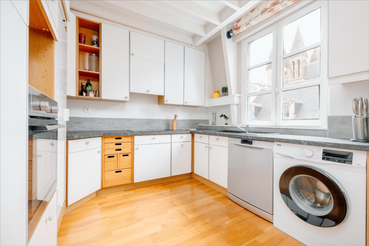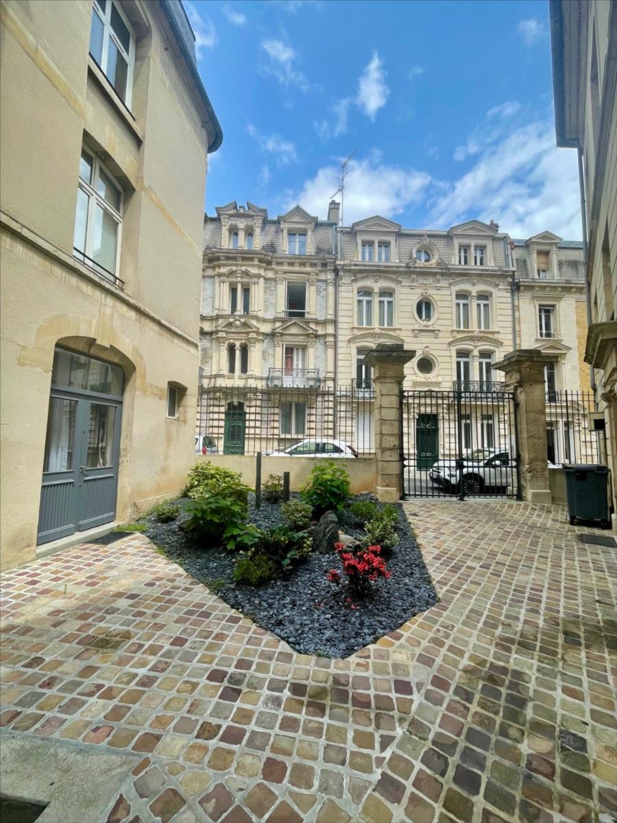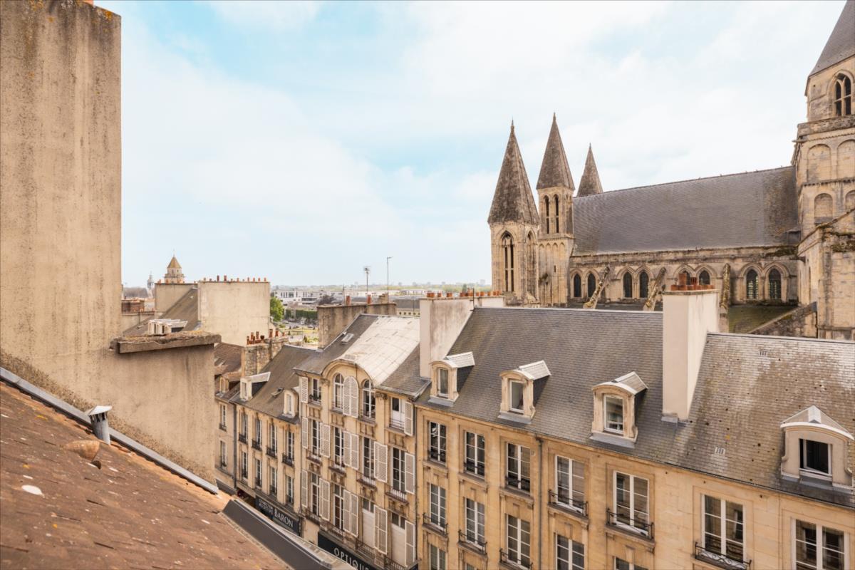 Hyper centre ville de Caen, dans une copropriété du XIXème siècle avec ascenseur, un appartement de standing en triplex comprenant une entrée avec placard, cuisine aménagée récente, séjour-salon orienté sud. A l'étage : pièce palière avec placards, deux chambres, salle de bains, wc.