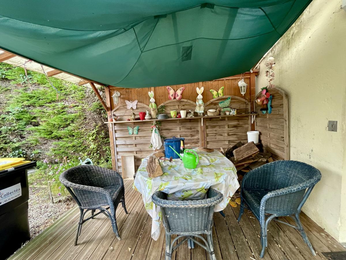 Vous profiterez d’une terrasse parfaite pour vos repas en plein air. Un appentis extérieur offre un espace de rangement. Le terrain clos d’environ 838 m² vous garantit intimité et tranquillité.