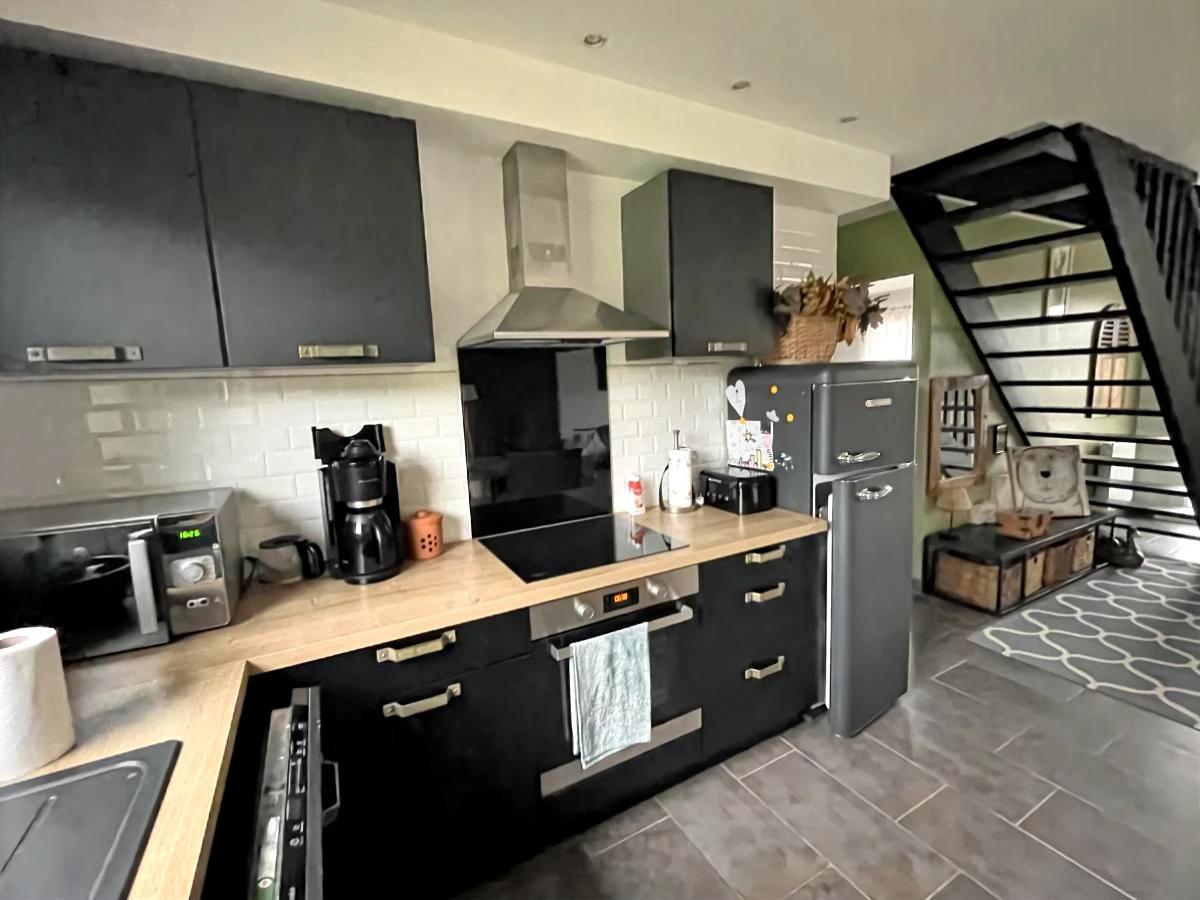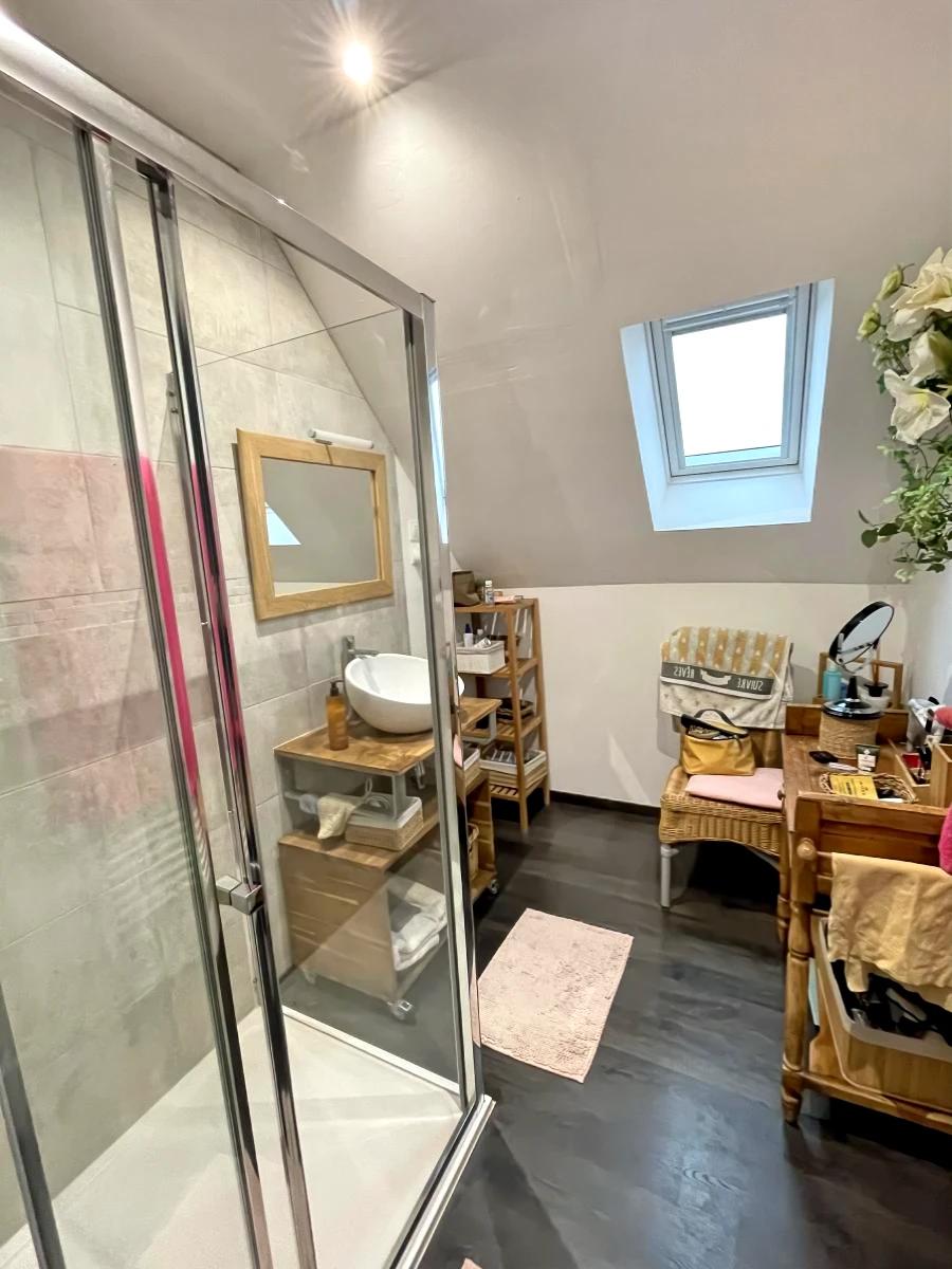 Au RDC : une belle pièce de vie lumineuse avec salon-séjour et cuisine A/E réchauffée par un poêle à granulés, ainsi qu’une chambre, une salle d’eau avec baignoire, un wc et une buanderie.