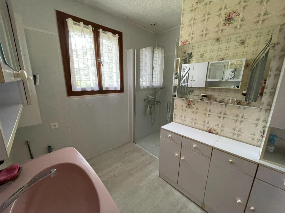 Au Rez-de-chaussée une vie de plein pied composée : d'une entrée et dégagement, séjour avec cheminée insert exposé Sud, une cuisine coin repas, 3 chambres, salle d'eau récente, wc.
