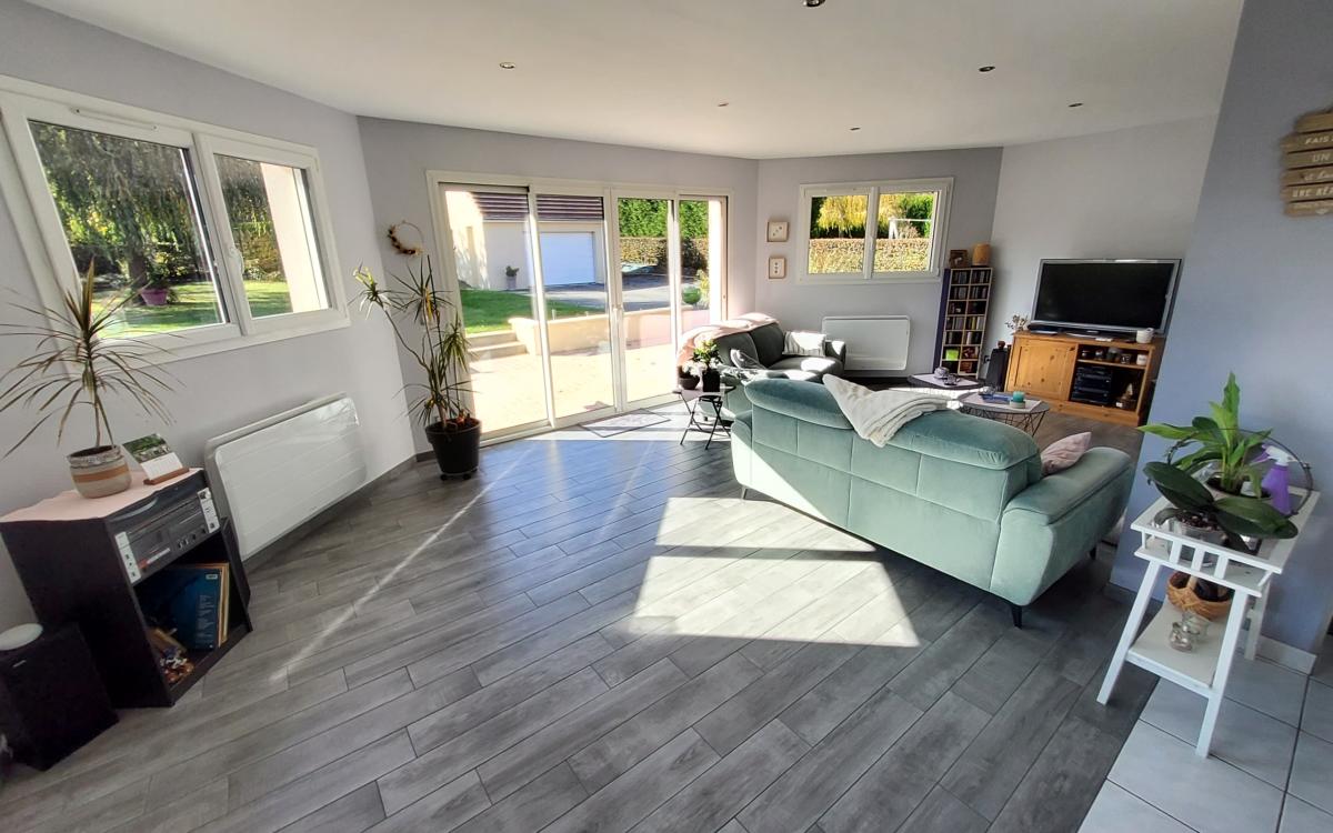 - au rez-de-chaussée : séjour-salon avec poêle à granules, cuisine ouverte aménagée et équipée, salon donnant sur terrasse plein sud, chambre, wc, salle d'eau.