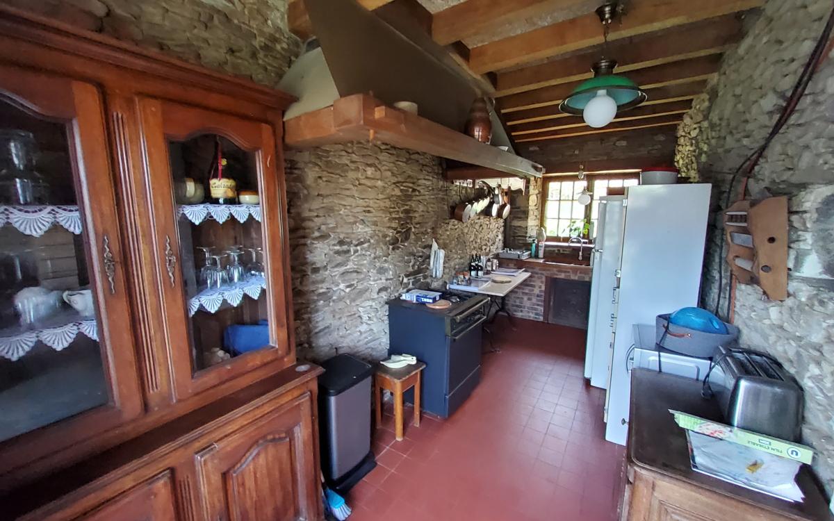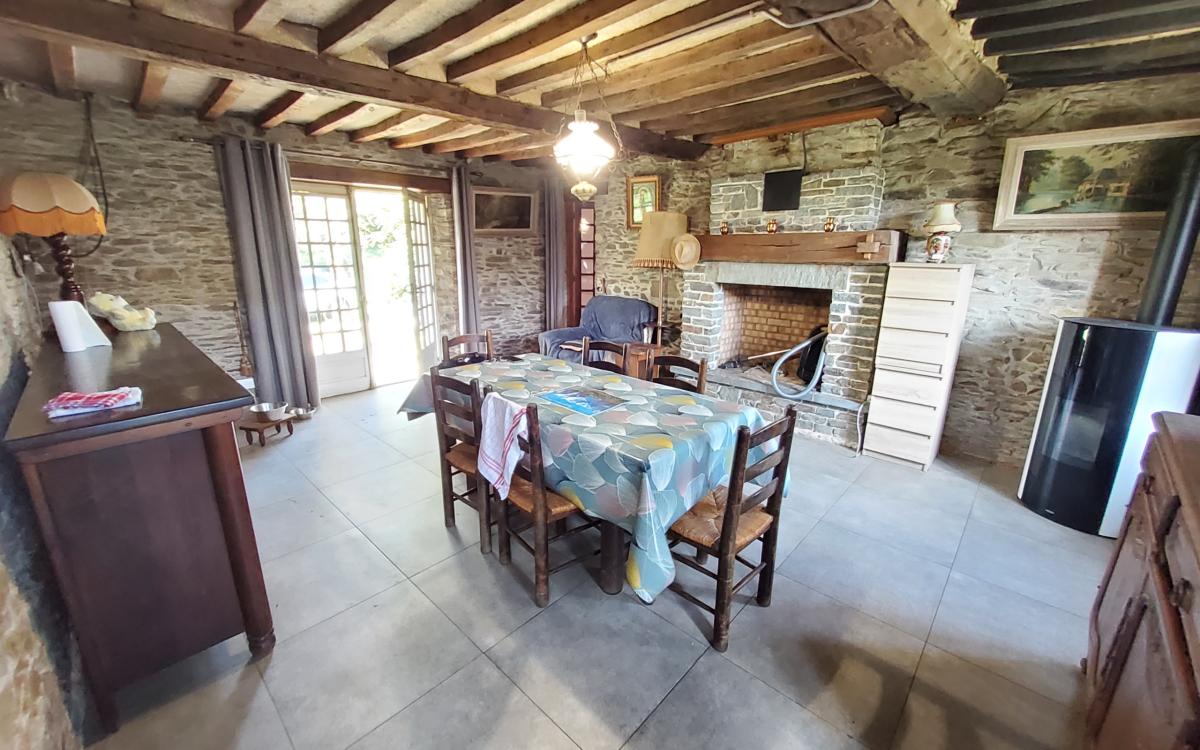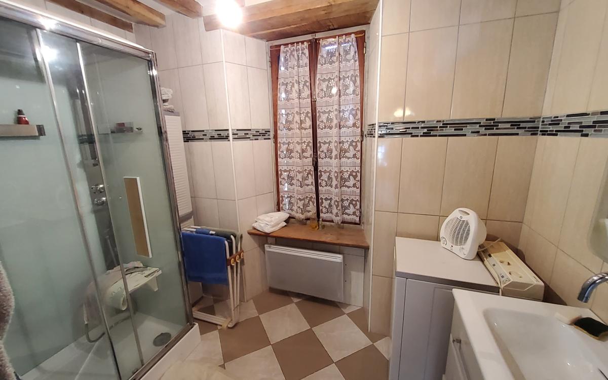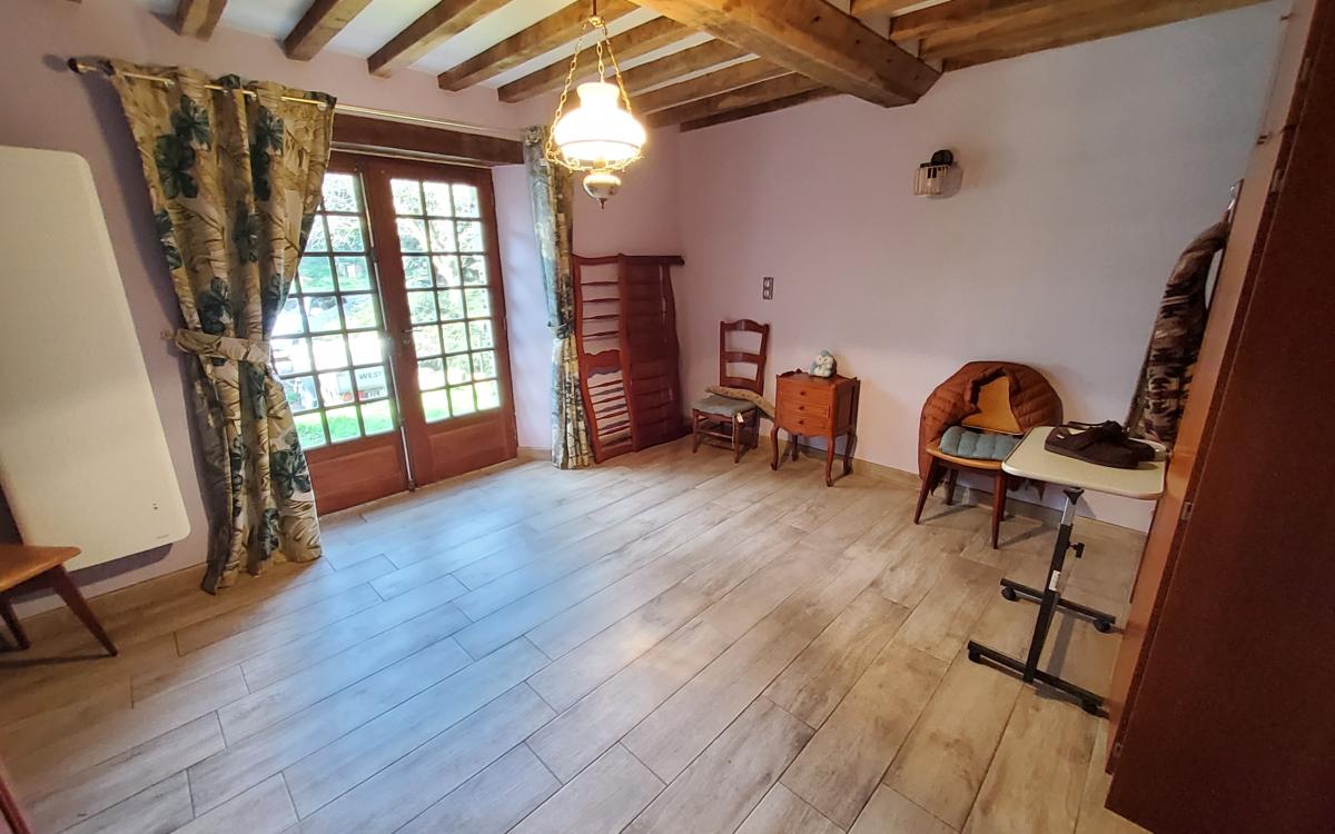 Séjour avec poêle à granulés, cuisine, chambre, salle d’eau et wc.