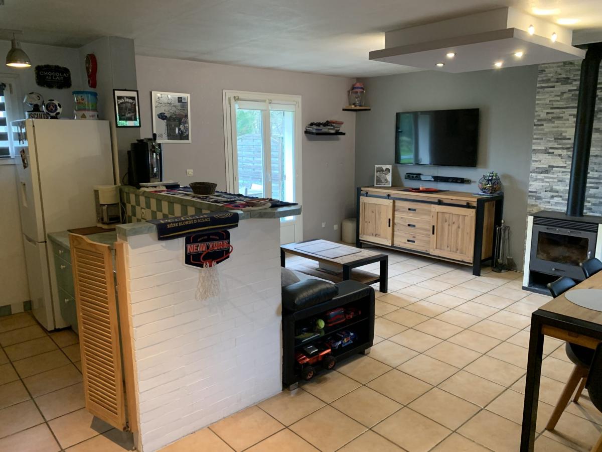 RDC: pièce de vie avec cuisine ouverte, dégagement, chambre, cellier, salle de bains et wc.
