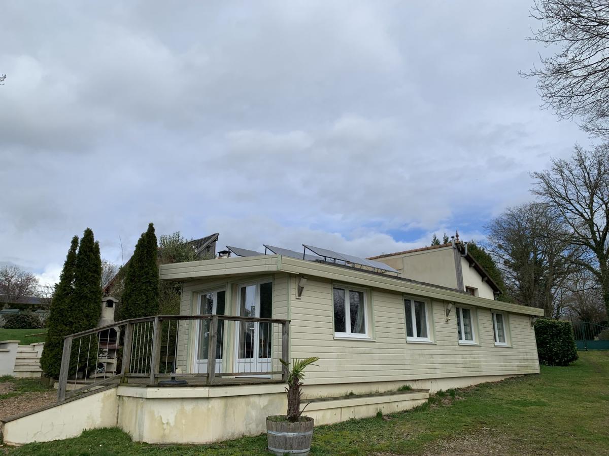 Maison de 115m²: séjour-salon, cuisine dînatoire, chambre, salle de bains et wc.