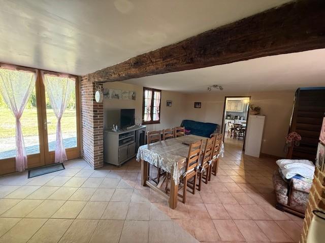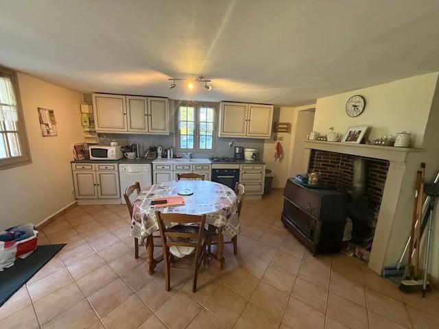 - Au rez-de-chaussée : cuisine avec coin repas et poêle à vois, salle d'eau, wc, salle-salon avec poêle à granulés, une chambre.