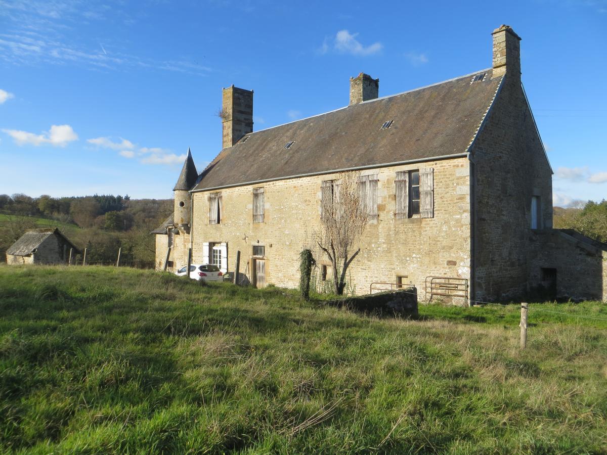 * UNE MAISON de MAÎTRE en pierres sous ardoises, avec échauguette, comprenant au rez-de-chaussée : une entrée, une pièce de vie avec cheminée Renaissance et poutres apparentes, une chambre avec placard et une salle de bains - WC, une réserve, un débarras, cave, une ancienne écurie, puis pour accéder à l'étage un escalier en granit à trois paliers avec colonnes en granit desservant une grande chambre avec cheminée et poutres apparentes, une pièce, et deux autres pièces avec cheminée , et grenier sur l'ensemble.