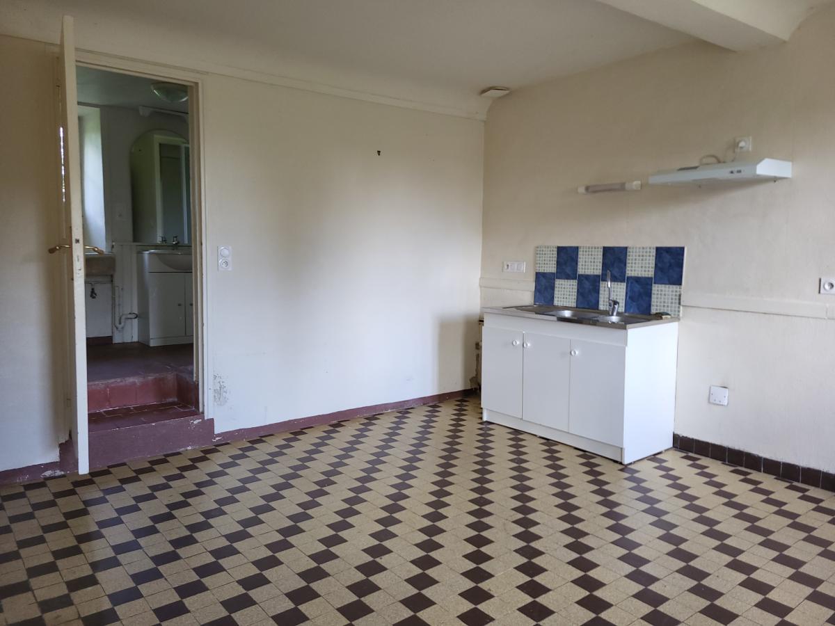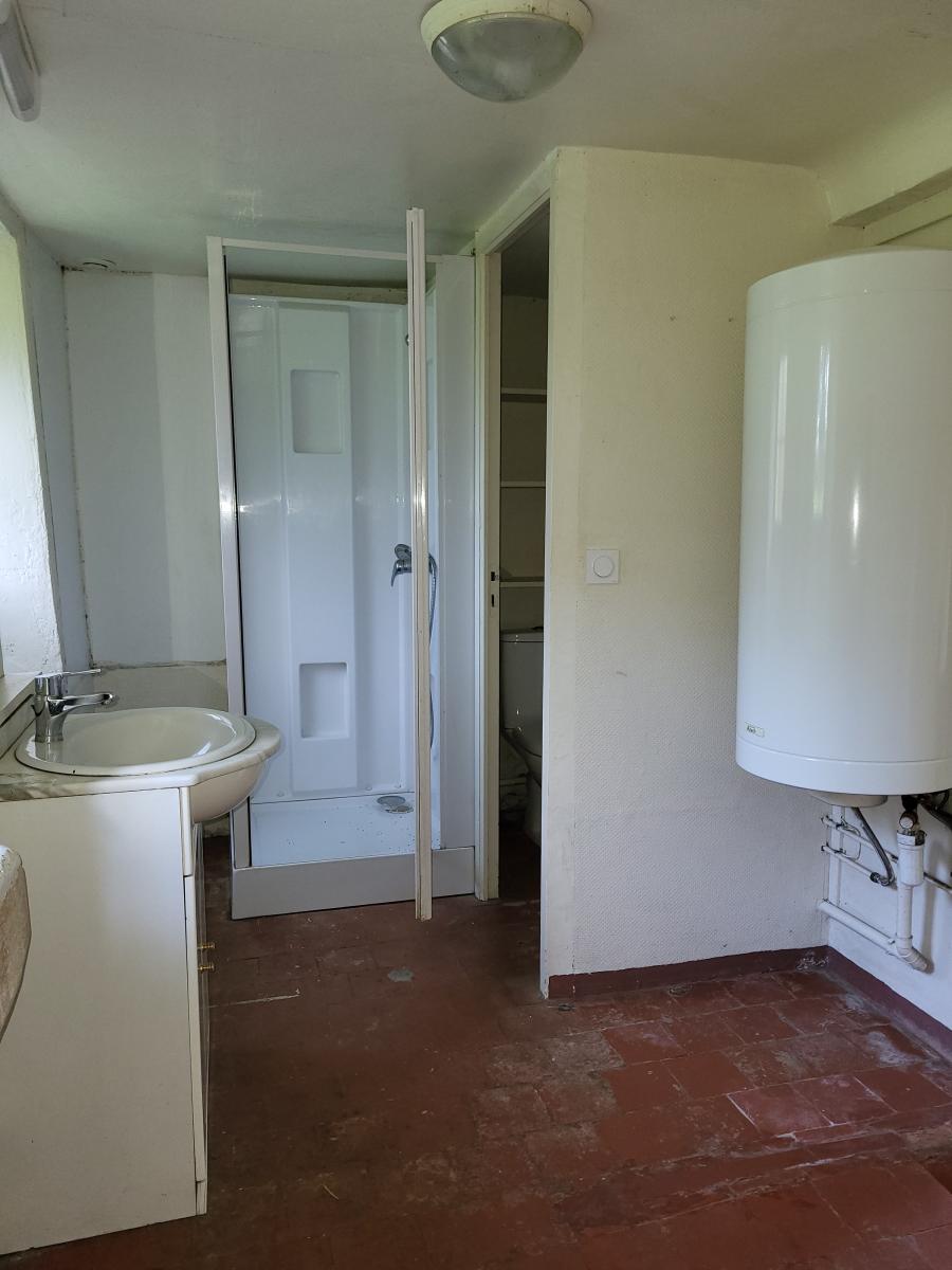 Au rez-de-chaussée : entrée, séjour-salon avec poêle à bois, cuisine, salle d'eau avec wc