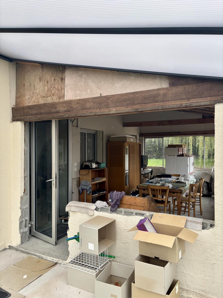 Au rez-de-chaussée : entrée par une véranda, pièce de vie avec cuisine ouverte, salon, salle d’eau et WC.