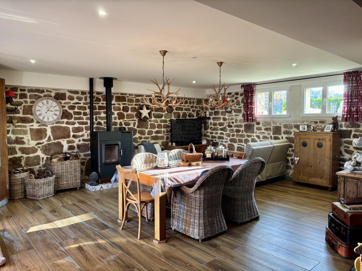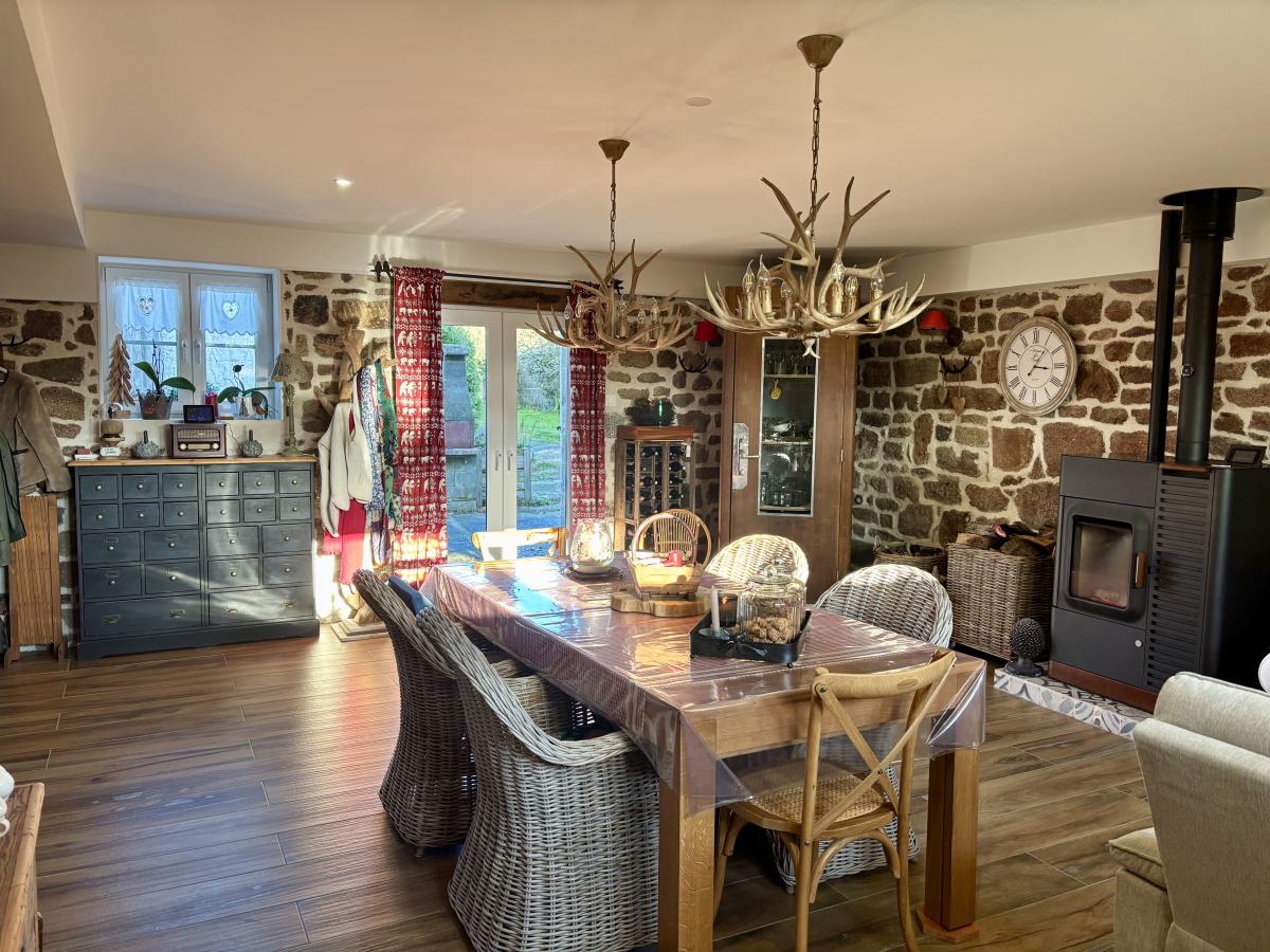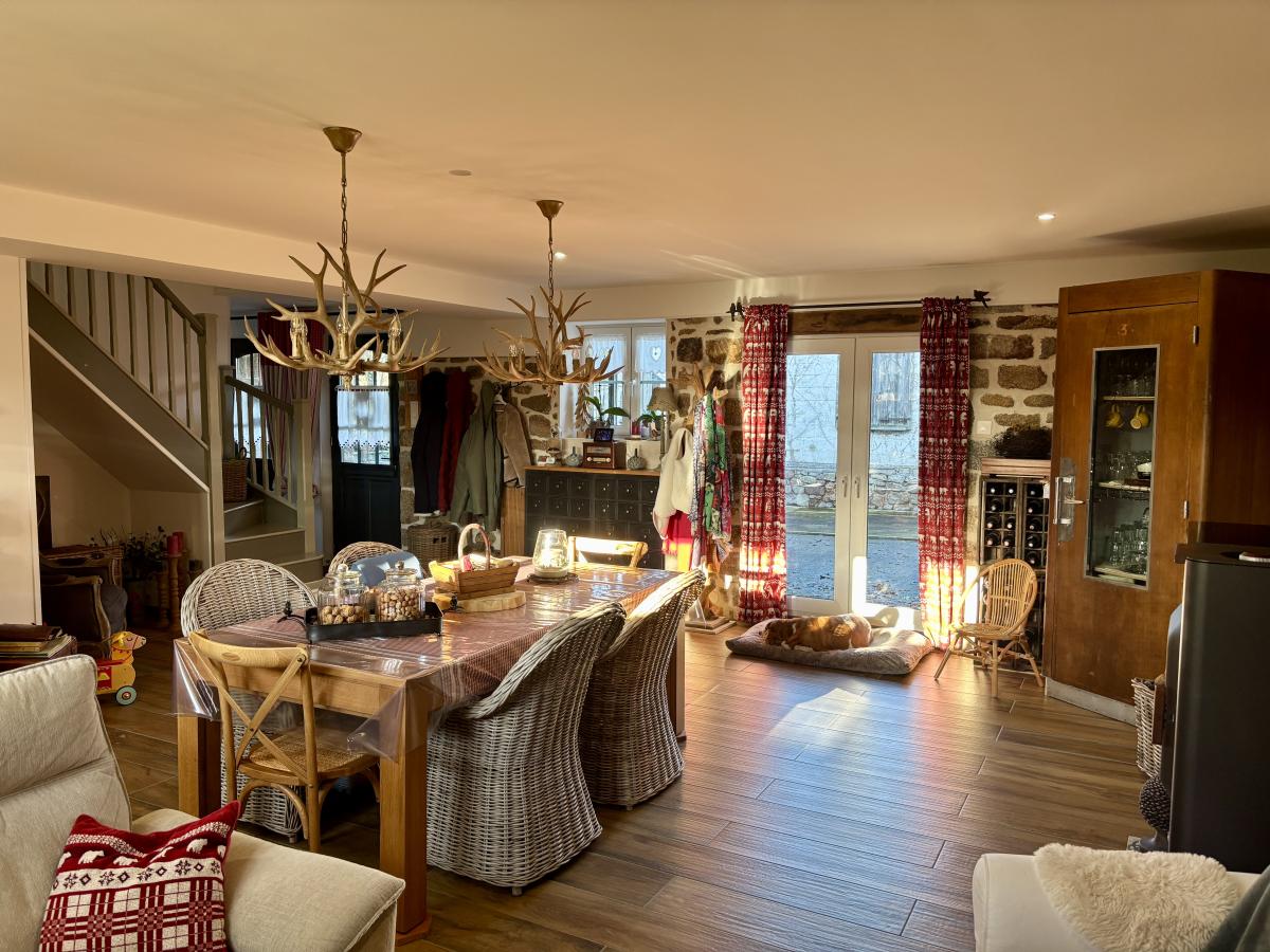 - Au rez-de-chaussée : un porche d’entrée, un salon chaleureux avec cheminée et poêle à bois, une grande cuisine conviviale, une vaste pièce de vie lumineuse regroupant salon et salle à manger, WC, cellier et chaufferie.