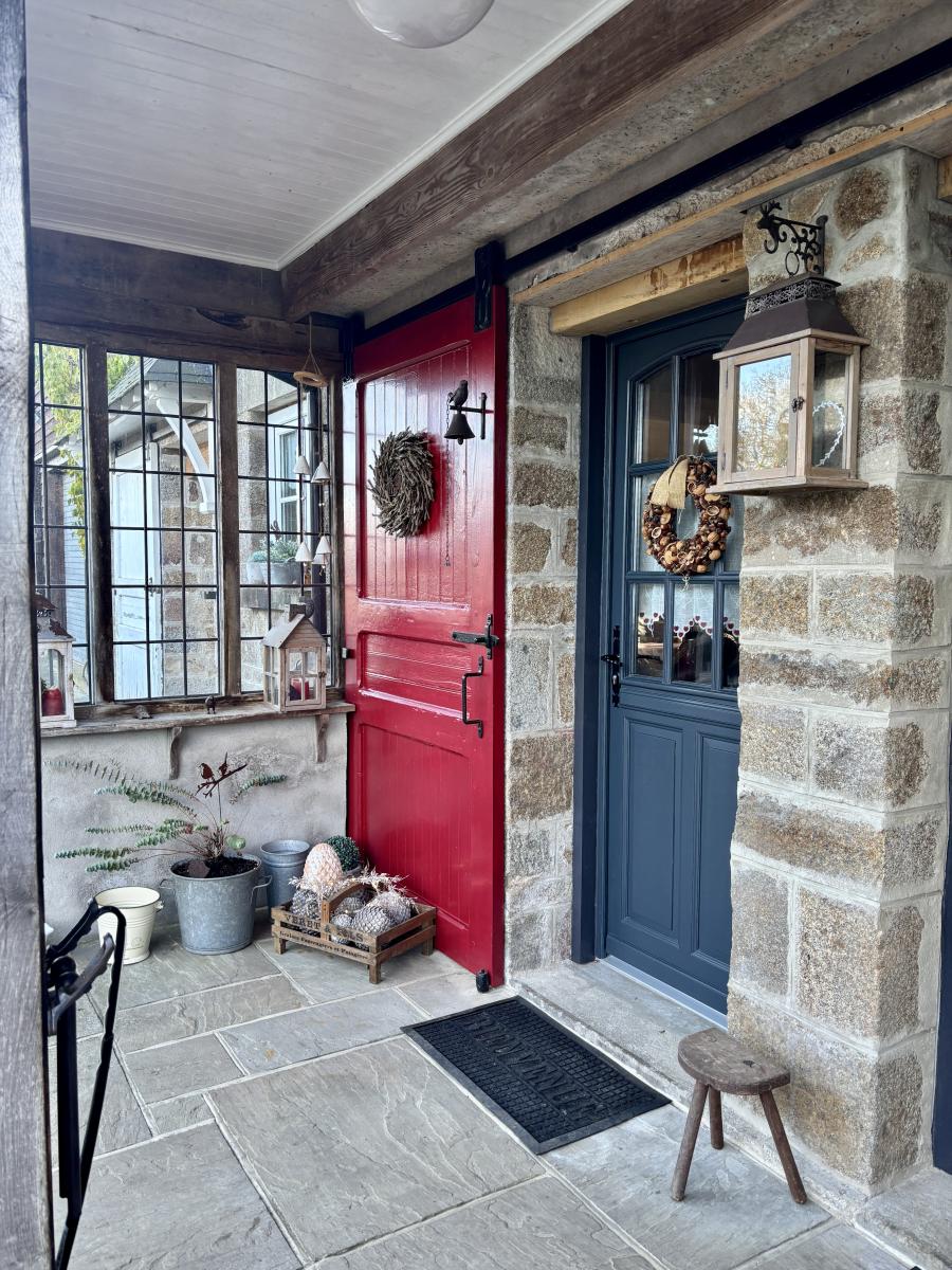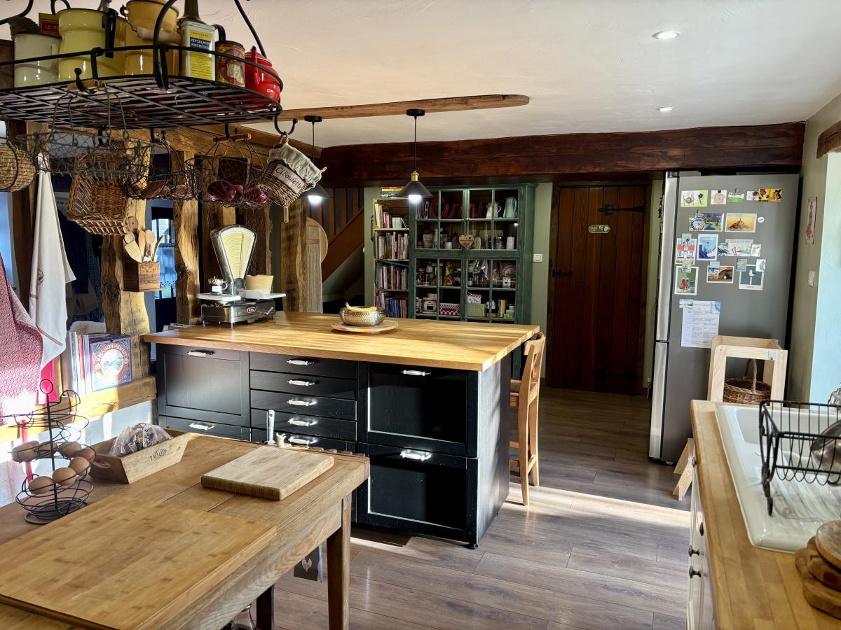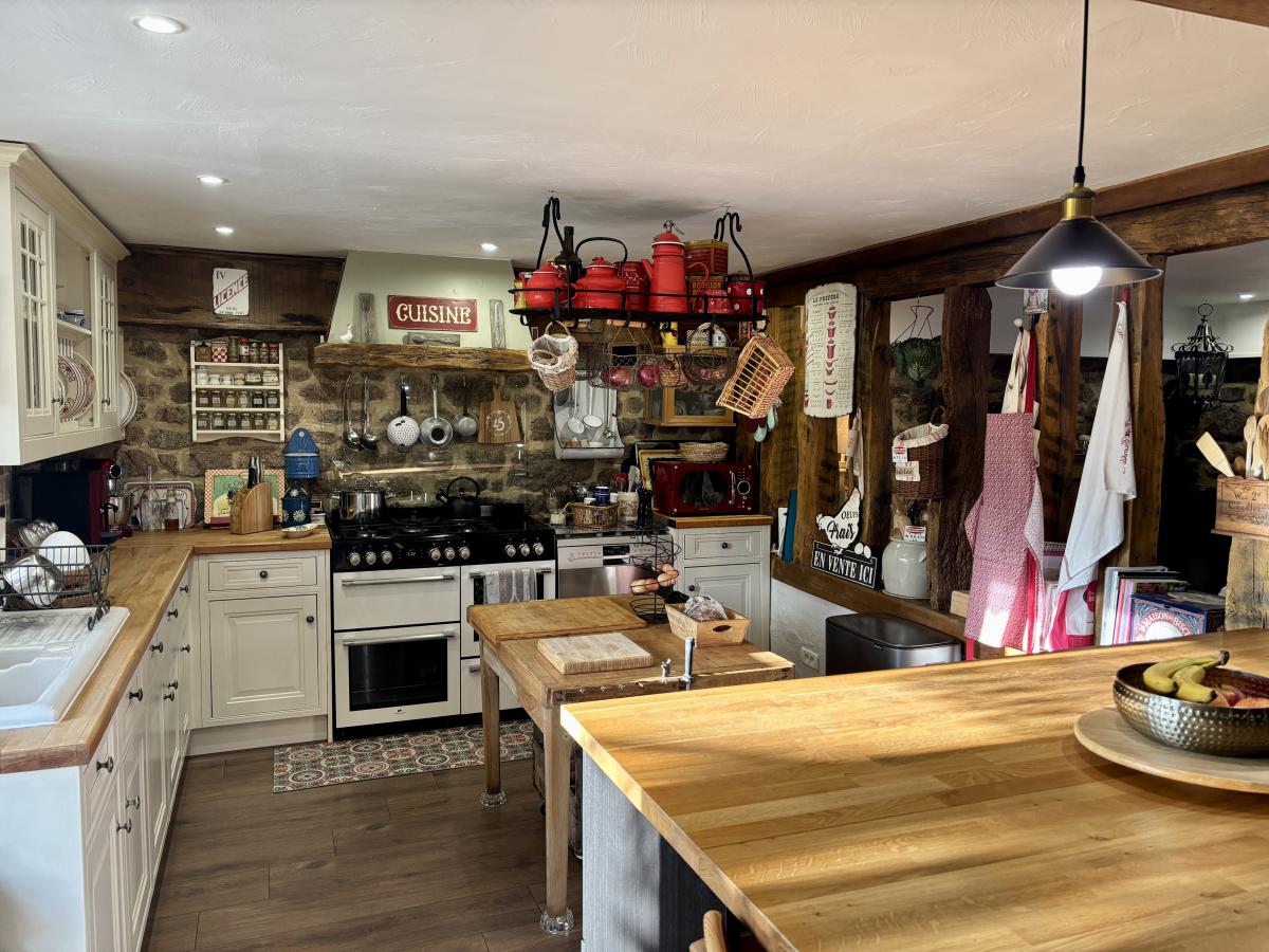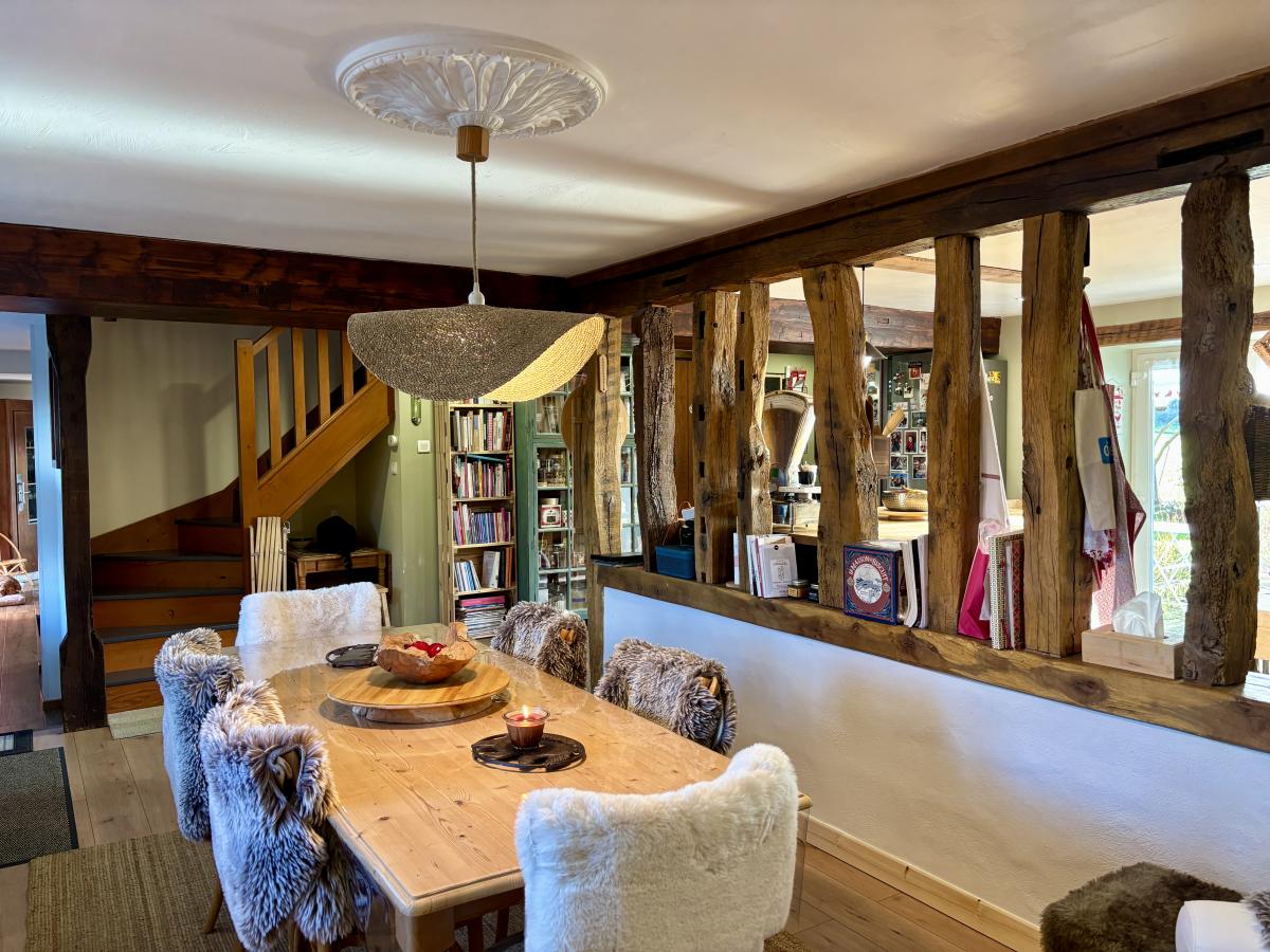 - Au rez-de-chaussée : un porche d’entrée, un salon chaleureux avec cheminée et poêle à bois, une grande cuisine conviviale, une vaste pièce de vie lumineuse regroupant salon et salle à manger, WC, cellier et chaufferie.