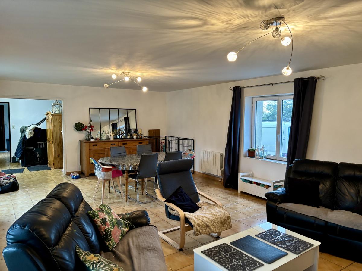 - Au rez-de-chaussée : entrée, cuisine aménagée et semi-équipée avec poêle à bois, vaste pièce de vie avec poêle à granulés, salle d'eau, WC et cellier/buanderie.