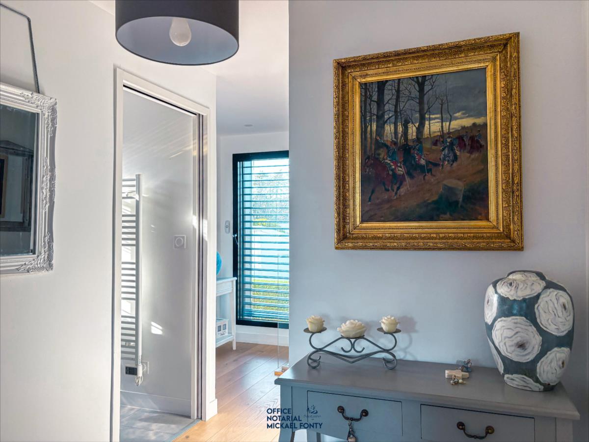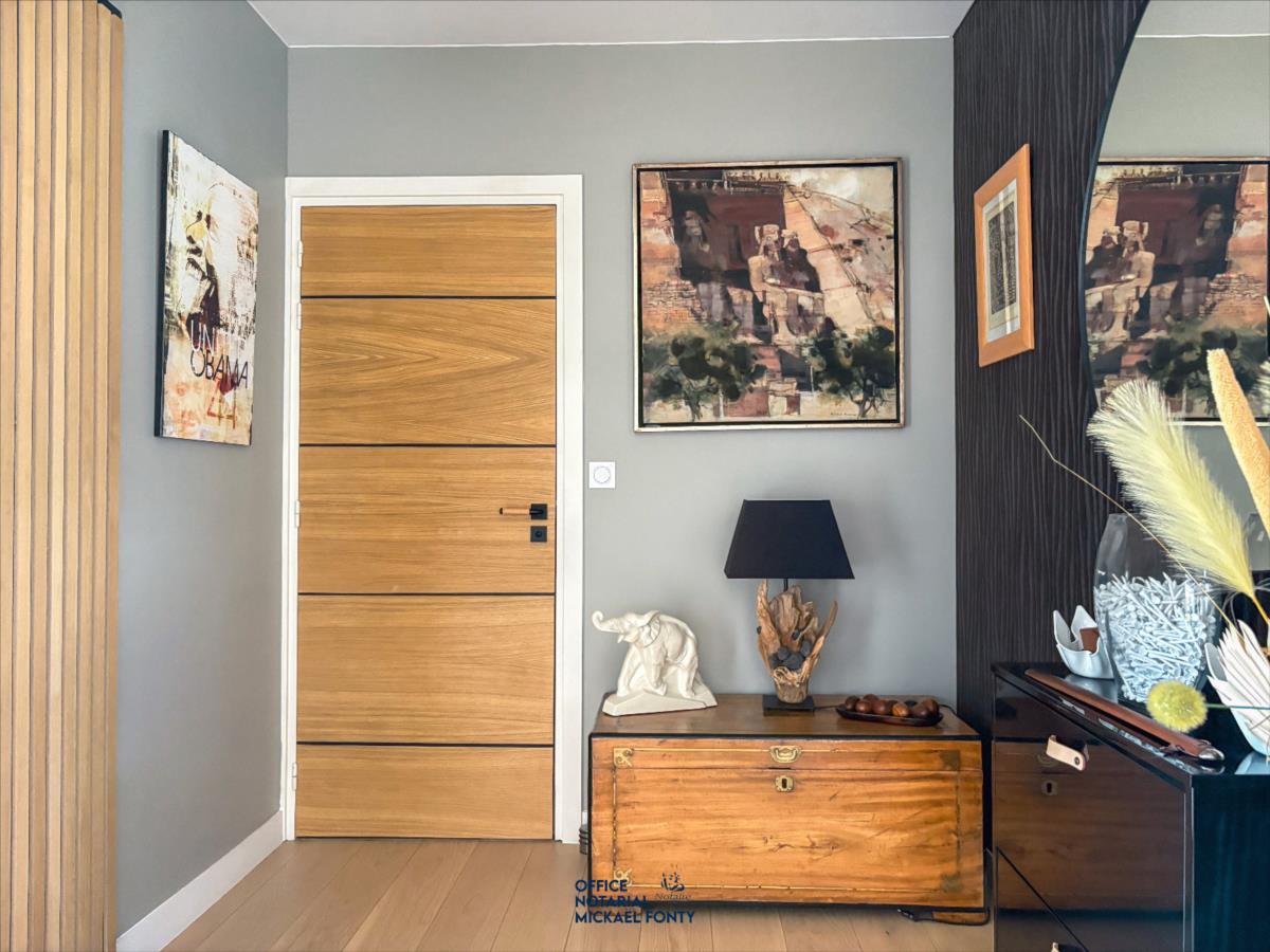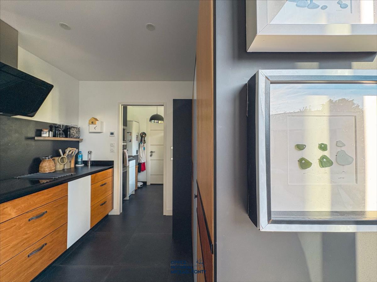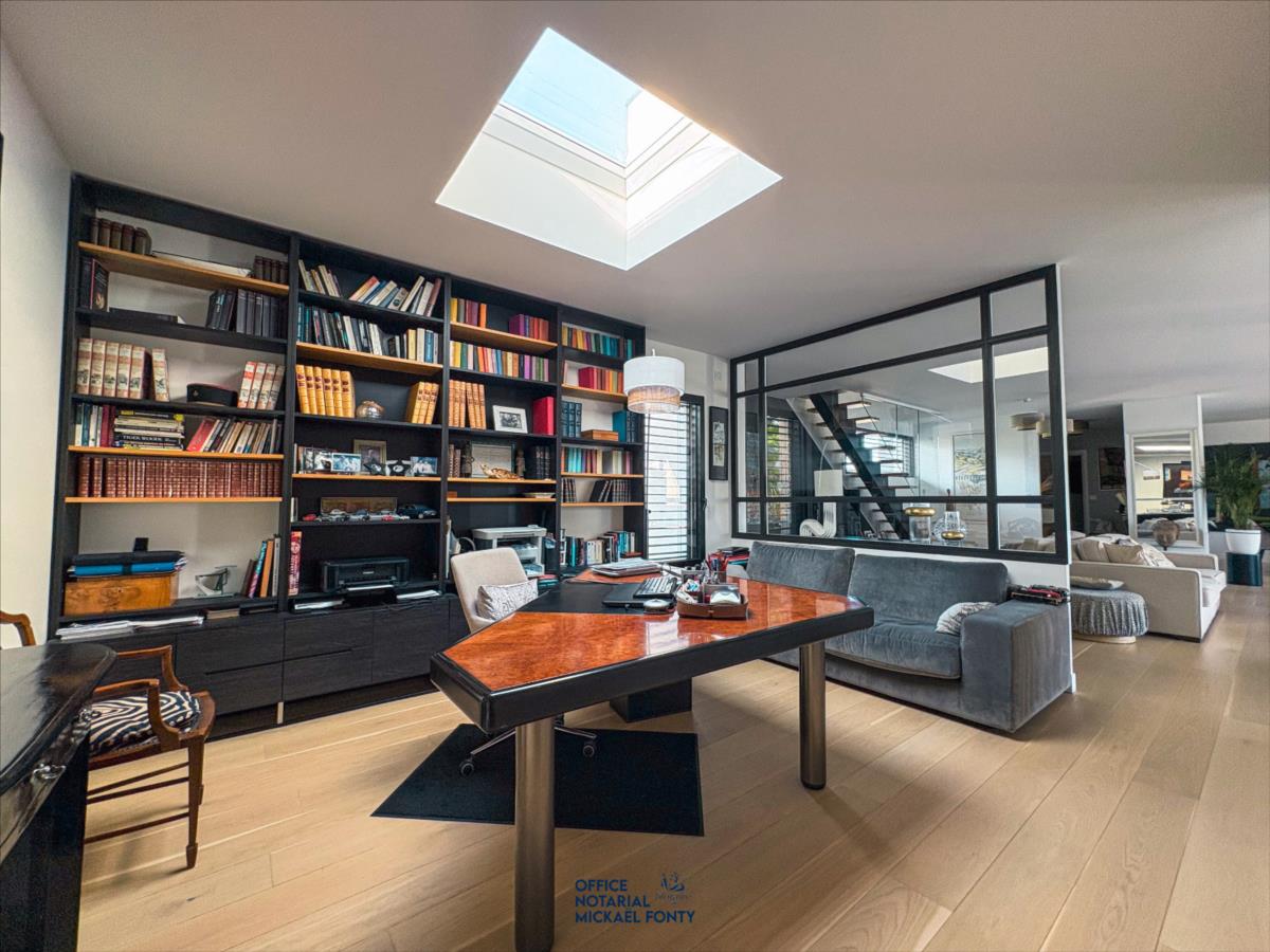 - une belle entrée avec WC indépendante et vestiaire,- une cuisine ouverte moderne entièrement équipée donnant sur une salle à manger et un vaste salon lumineux,- un bureau chaleureux et fonctionnel,- deux chambres avec une salle d'eau spacieuse incluant douche, baignoire, et un second WC indépendant, dressing.