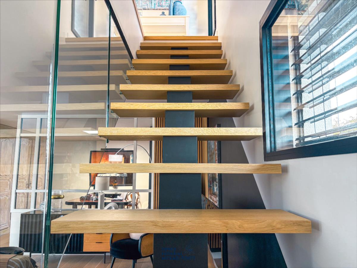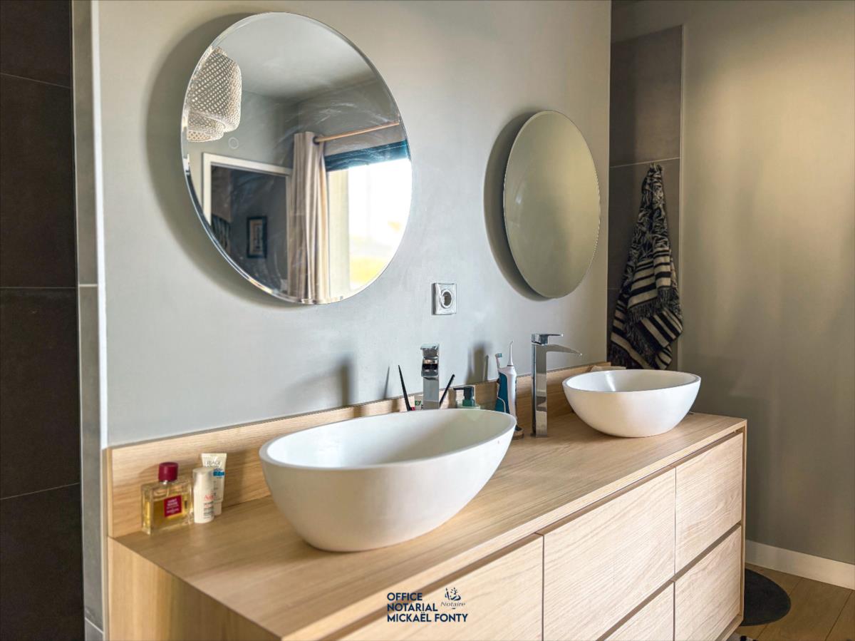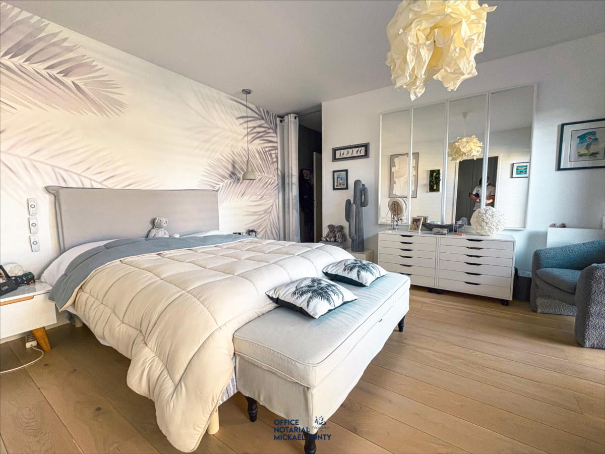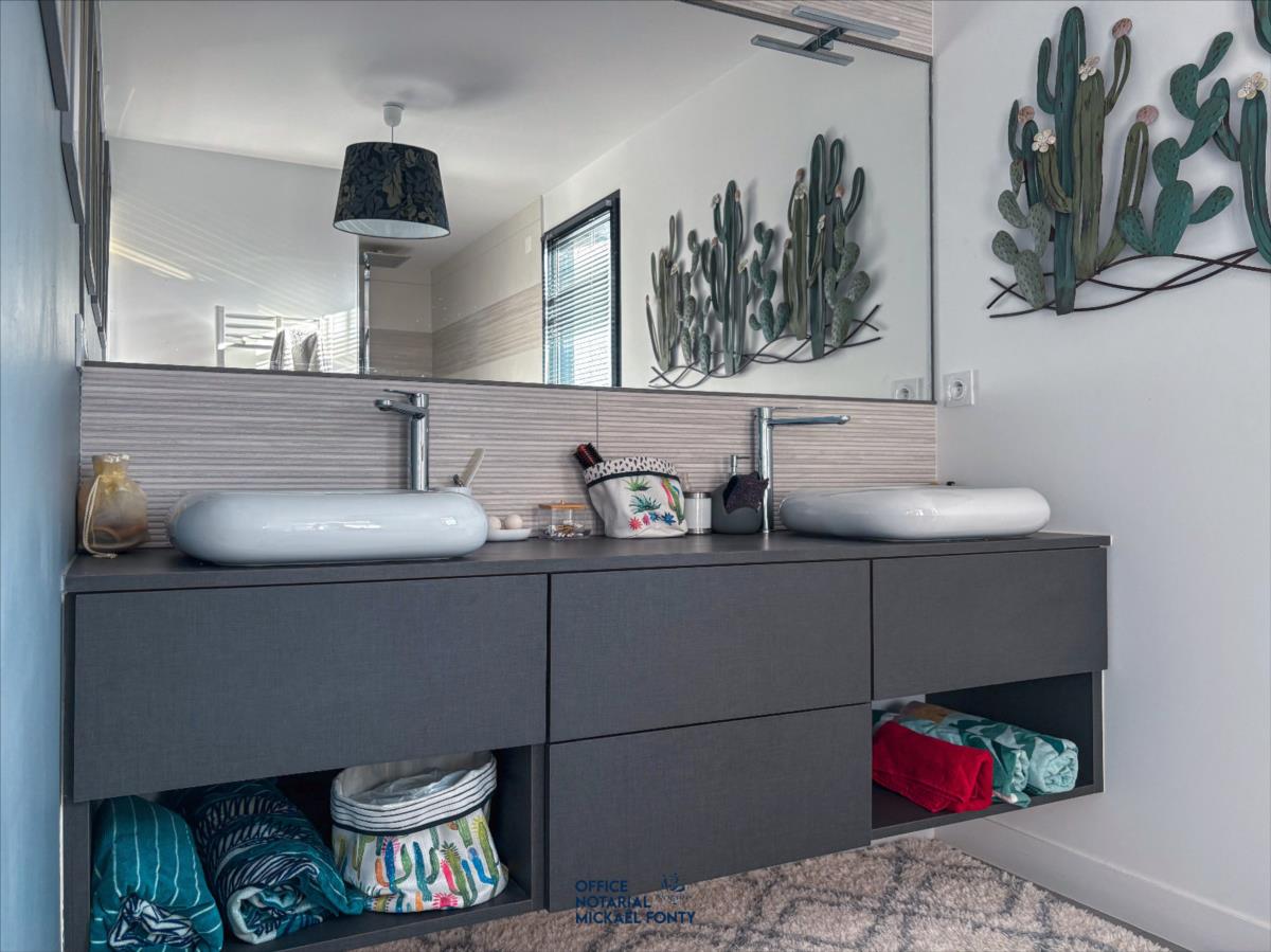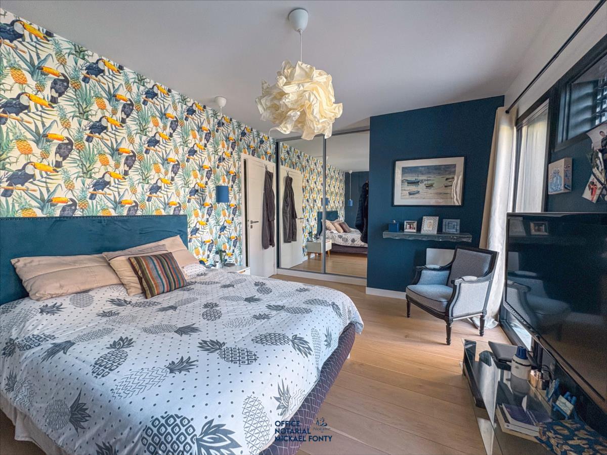 - une belle entrée avec WC indépendante et vestiaire,- une cuisine ouverte moderne entièrement équipée donnant sur une salle à manger et un vaste salon lumineux,- un bureau chaleureux et fonctionnel,- deux chambres avec une salle d'eau spacieuse incluant douche, baignoire, et un second WC indépendant, dressing.