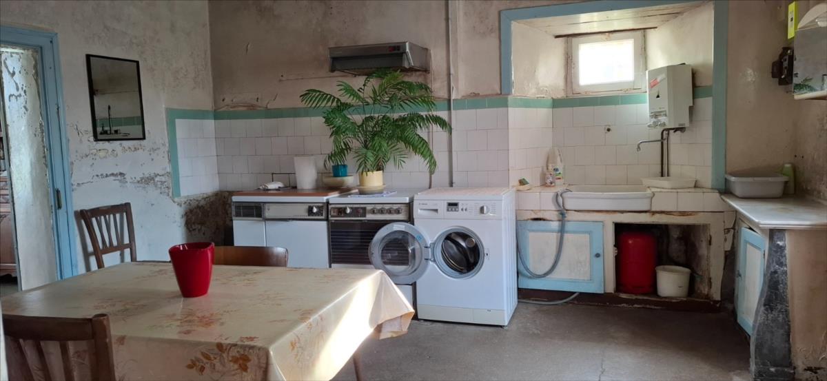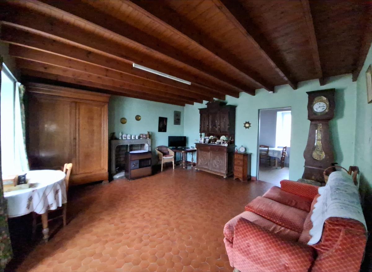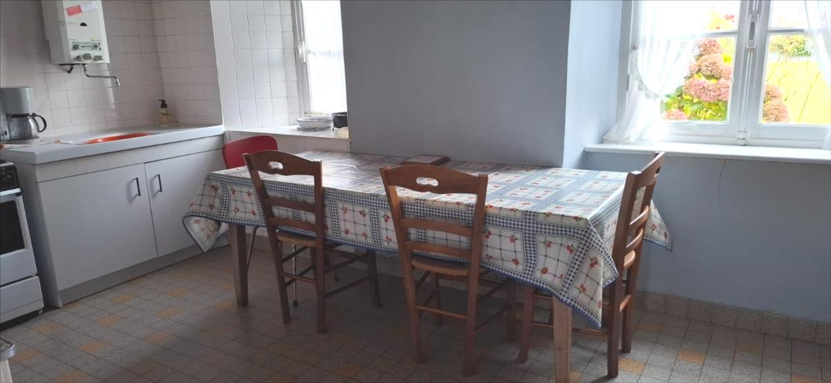 au rez-de-chaussée : séjour avec poêle à fioul, cuisine, dégagement - couloir, WC,