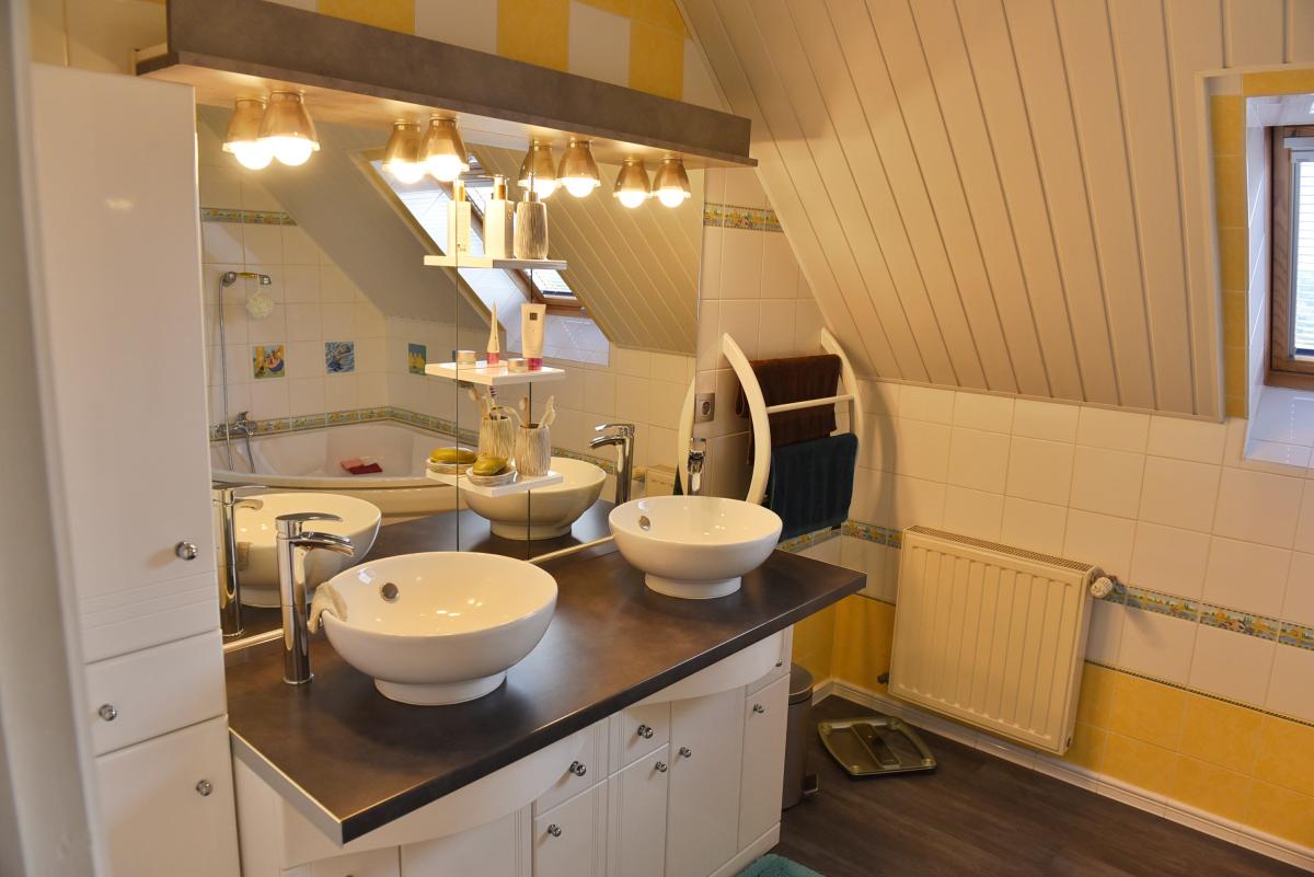 - A l’étage : mezzanine (possibilité de créer une chambre), trois chambres avec placards, grande salle de bains avec baignoire et douche avec meuble double vasque, WC.