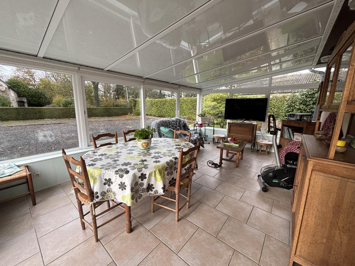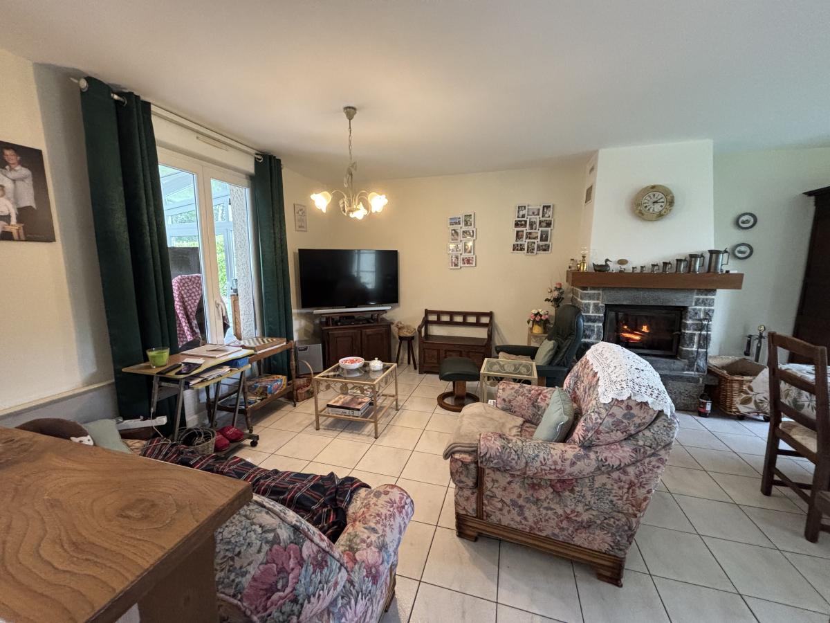 Entrée dans véranda de 24.66m², entrée avec dégagement, séjour/salon de 30.05m² avec insert, cuisine de 8.09m² ouverte aménagée et équipée (four, plaque, hotte, frigo) et îlot central, dégagement avec placard, salle de douche avec évier, trois chambres (11.63m², 11.55m² et 8.09m²), WC, deux garages attenants.