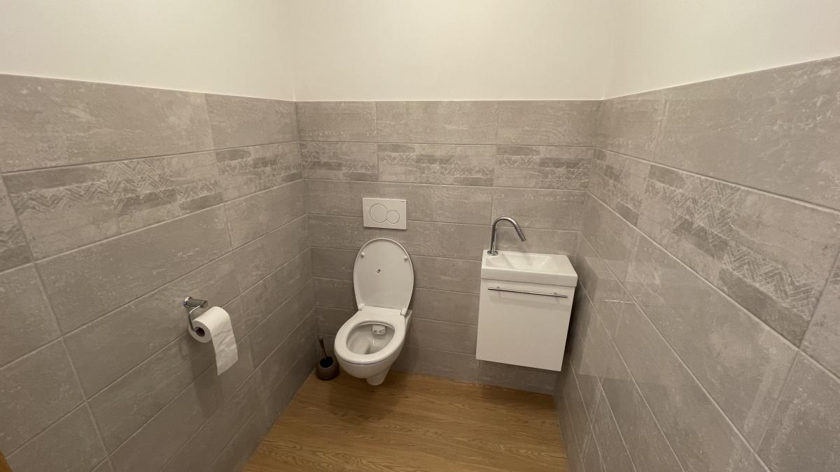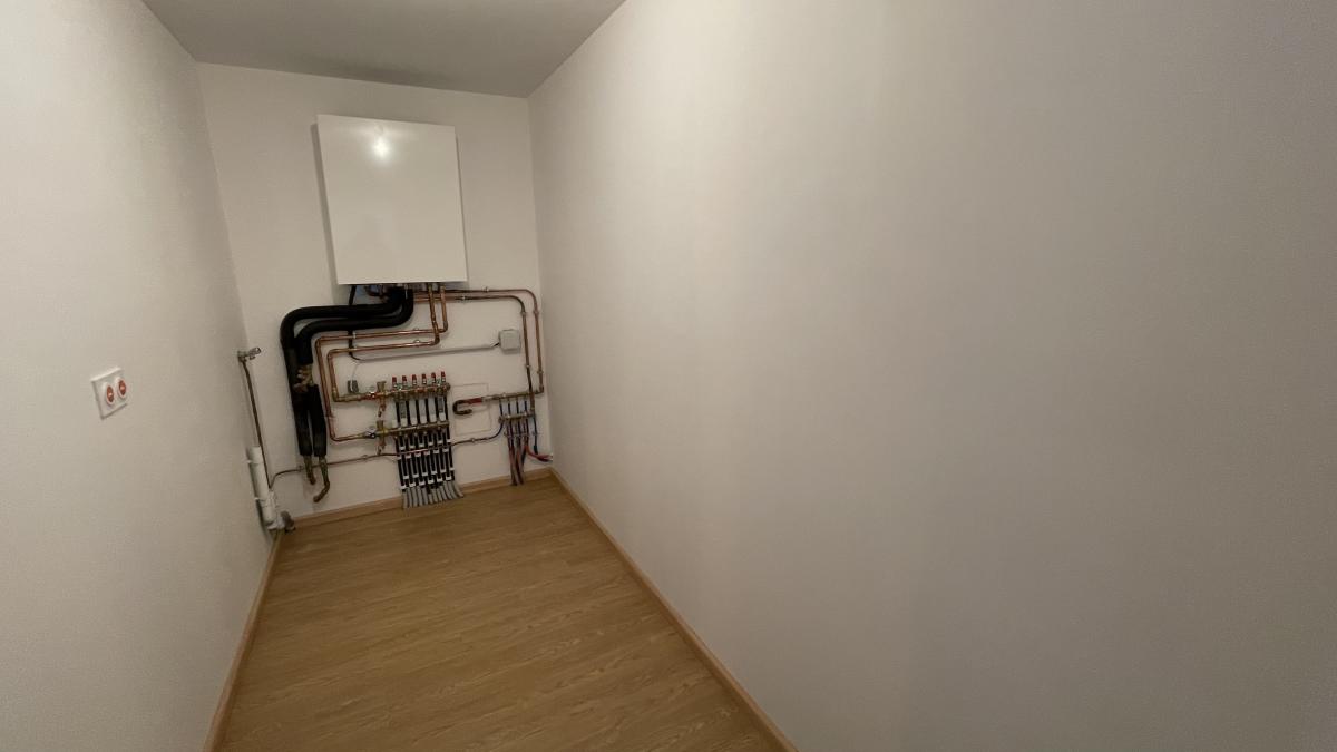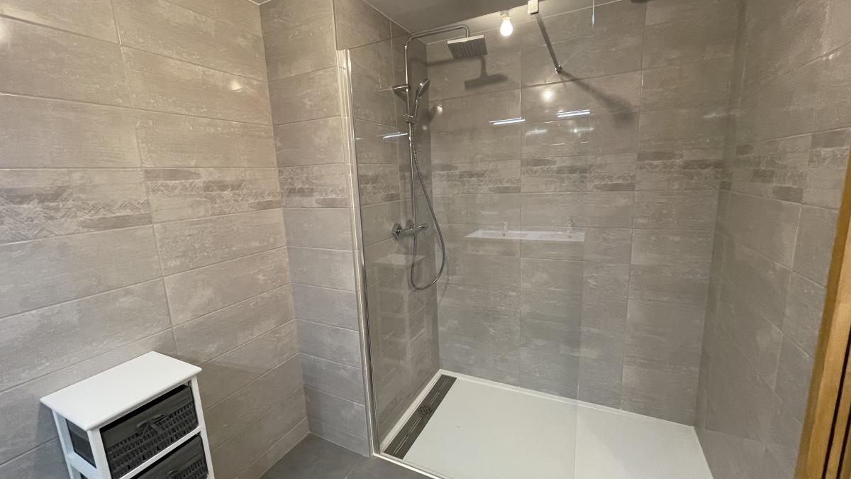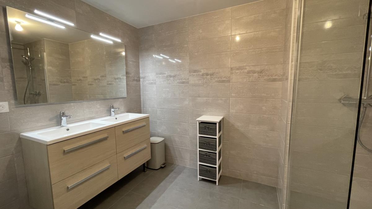 - Entrée, cuisine aménagée et équipée (évier, plaque vitro, hotte aspirante) ouverte sur séjour/salon, buanderie, trois chambres dont une avec placard, salle d’eau (douche, meuble double vasque, sèche serviette), WC avec lave mains.