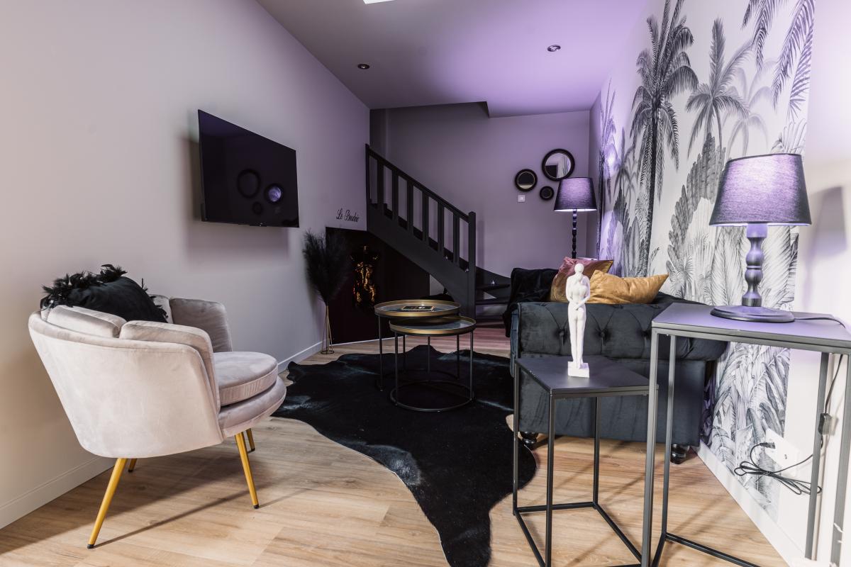 Au rez-de-chaussée, elle se compose d’un espace de vie comprenant une cuisine entièrement aménagée et équipée, ainsi que d’une salle de bain et wc. Cette dernière dispose d’un accès direct vers un jacuzzi situé en extérieur.