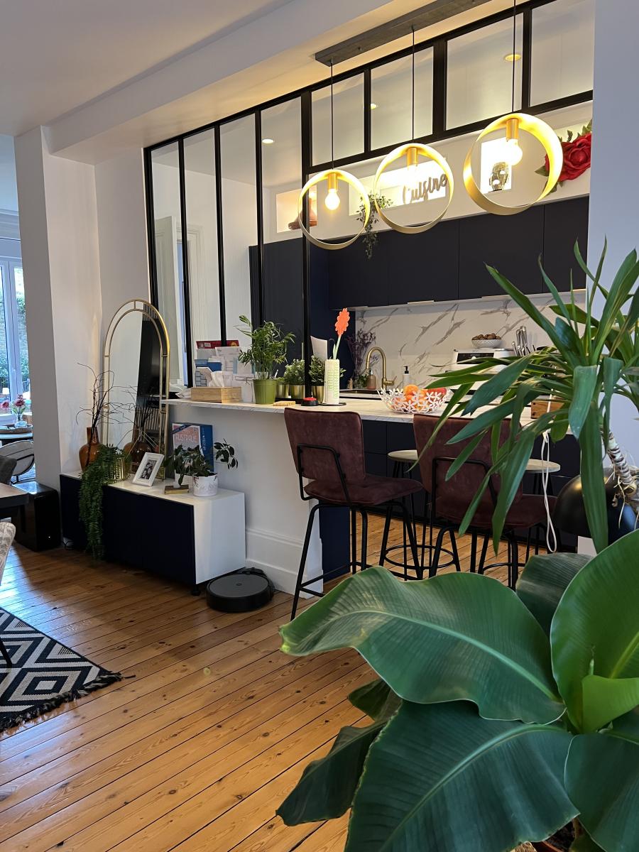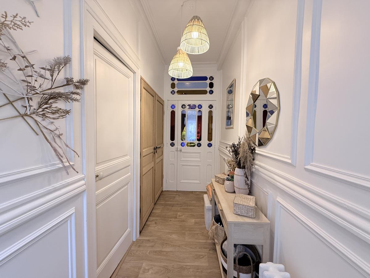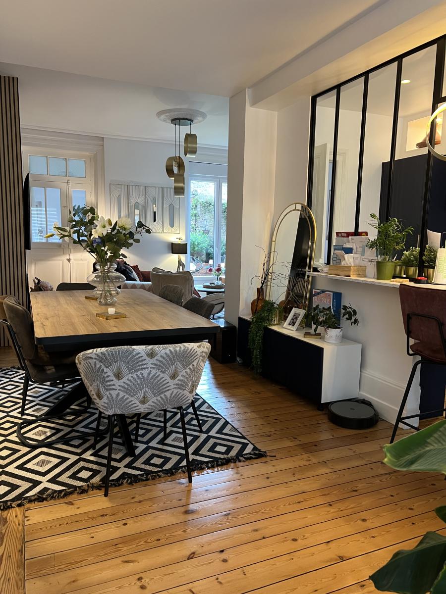 Entièrement repensée par son propriétaire, cette maison respire le bon goût et offre des volumes généreux. L'entrée avec WC indépendants et penderie, met en valeur les matériaux nobles comme les parquets anciens et les belles hauteurs sous plafond.
