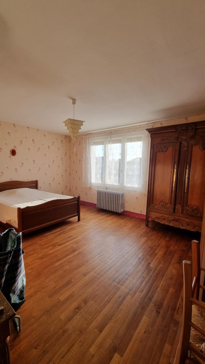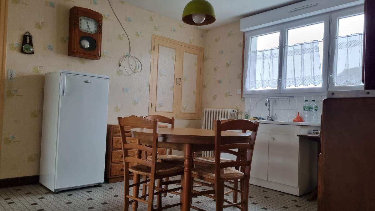 Rez-de-chaussée surélevé : entrée, une salle/salon, cuisine, couloir desservant deux grandes chambres, une salle d'eau, wc.