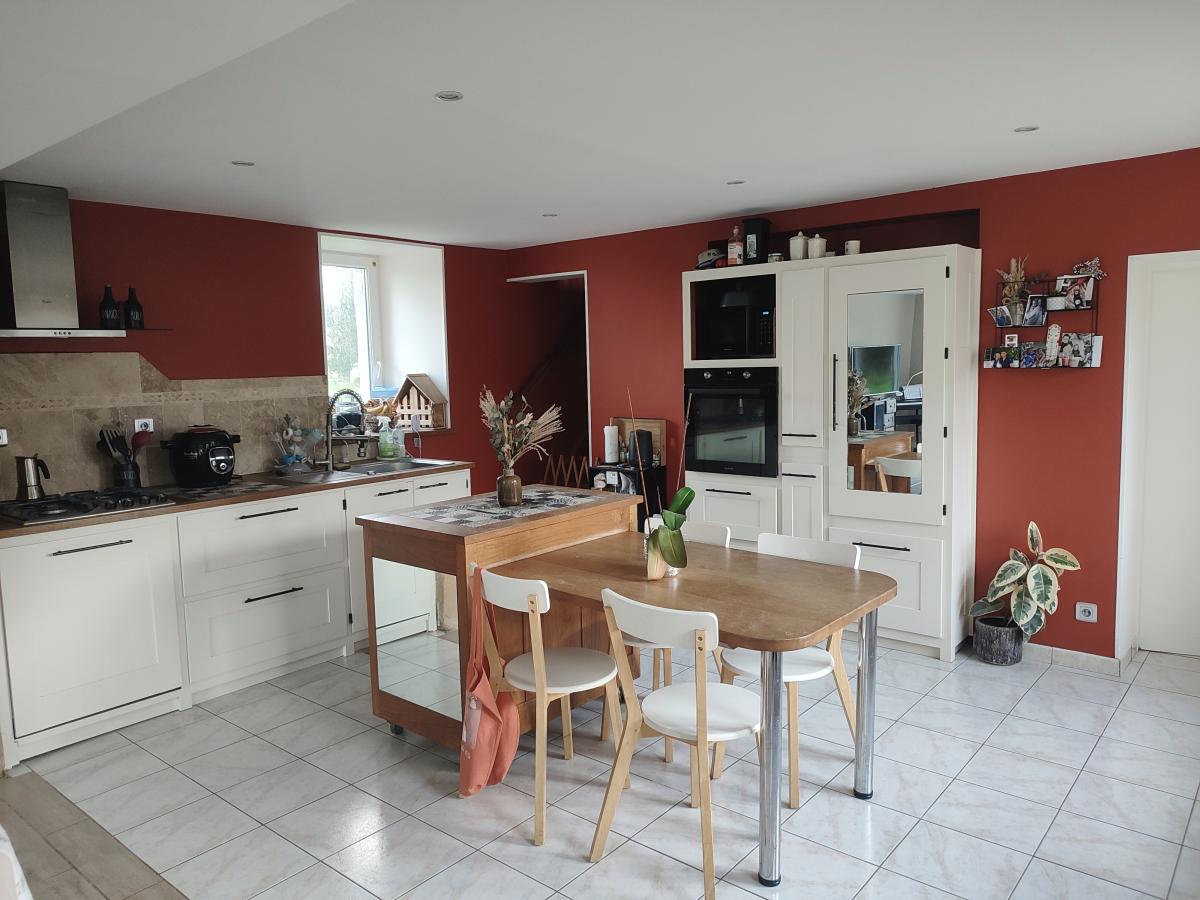 Au rez-de-chaussée : séjour/salon avec poêle à bois ouvert sur la cuisine aménagée et équipée, buanderie, wc.
