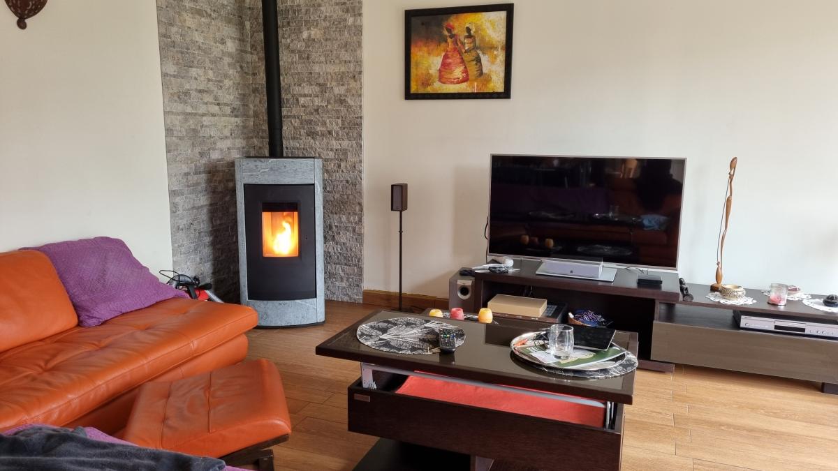 Au rez-de-chaussée : Entrée avec dressing, un grand séjour/salon avec poêle à pellets et accès à la terrasse plein sud, une cuisine aménagée et équipée, arrière-cuisine/buanderie, une chambre avec salle d'eau, un wc avec lave-mains.