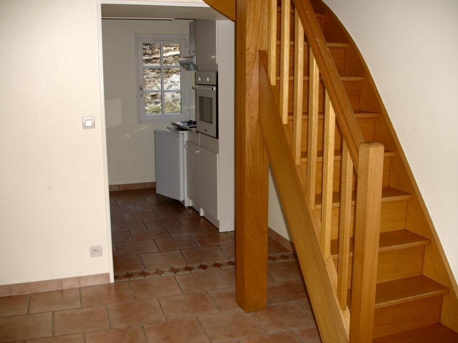 - Au Rez-de-Chaussée : Salon avec escalier menant aux étages ; cuisine ouverte aménagée (placards, bloc-évier inox un bac, deux plaques de cuisson électriques, réfrigérateur, hotte électrique, four encastré électrique).