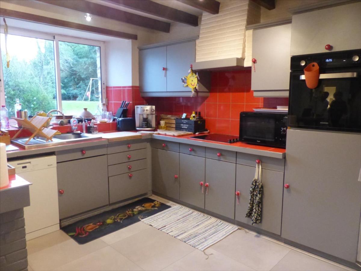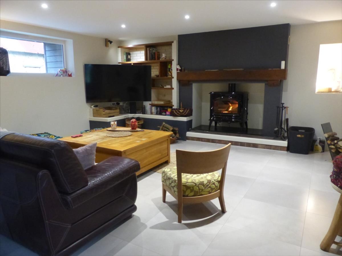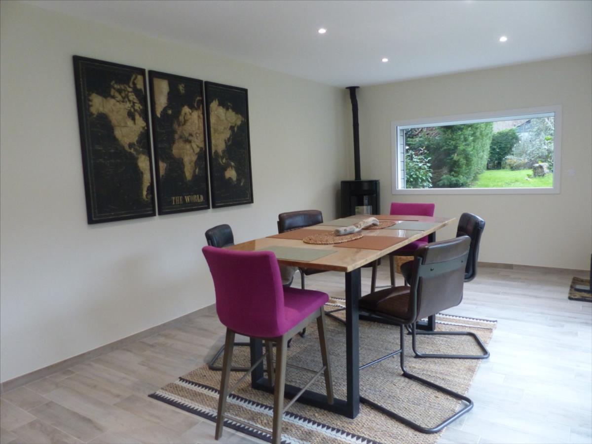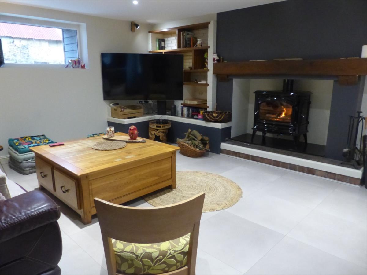 ouverte sur salon avec cheminée avec poêle à bois, salle à manger avec poêle à