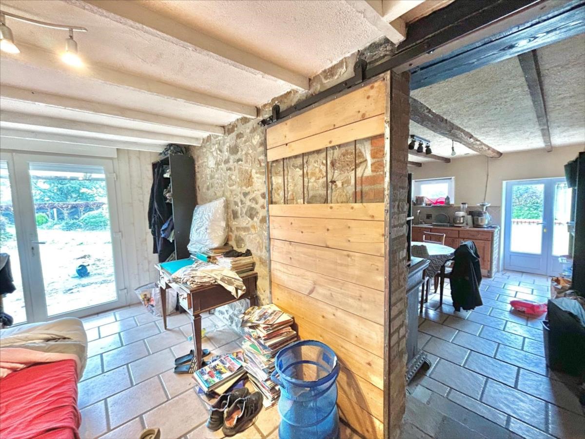 Au rez-de-chaussée: entrée sur extension avec terrasse couverte, pièce à vivre (actuellement utilisée en chambre de plain-pied), dégagement ouvrant sur WC, buanderie, cuisine aménagée/salle à manger, salle d'eau, salon avec poêle à bois, accès à autre terrasse.