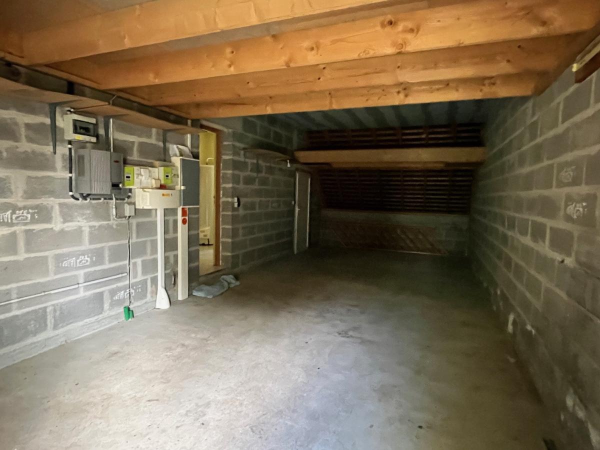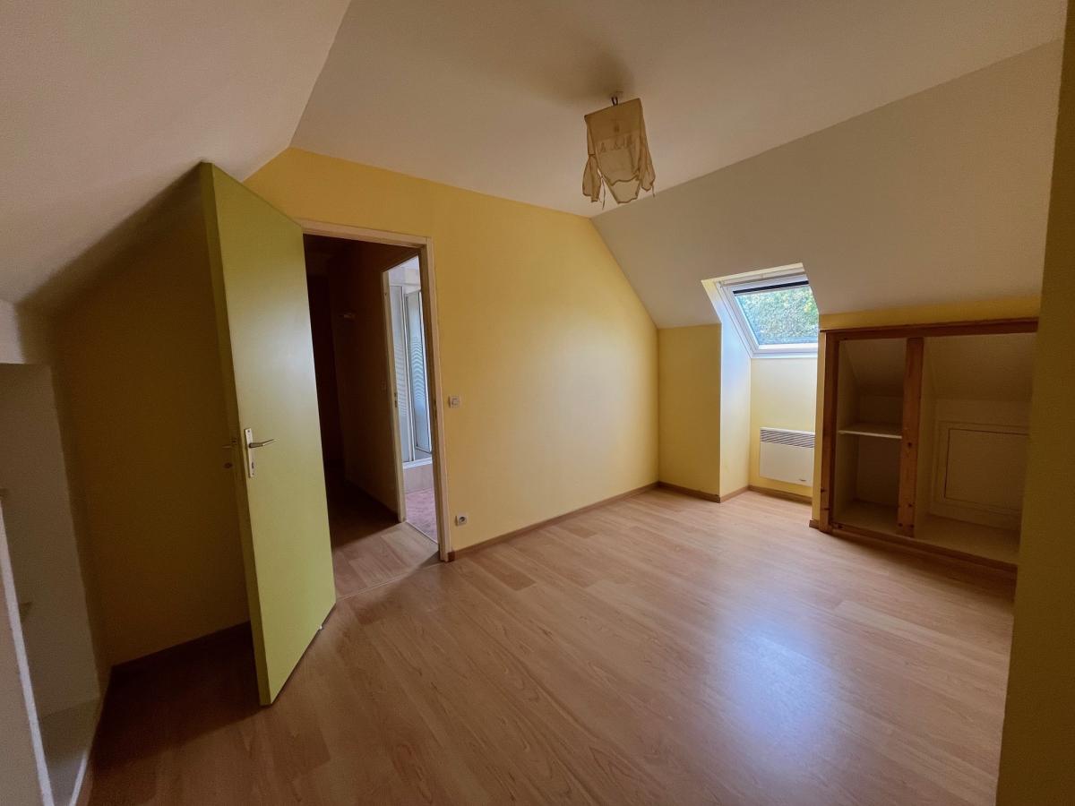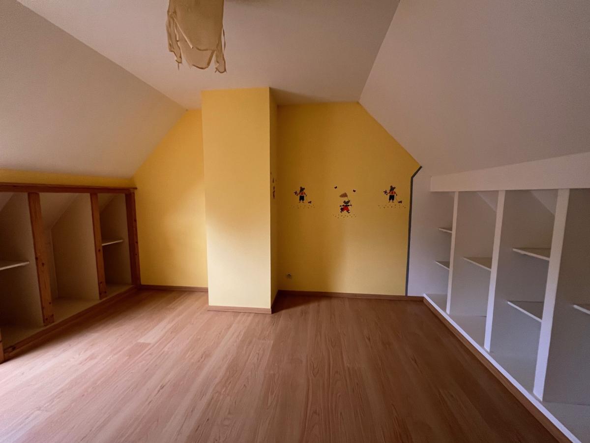 A l'étage : une pièce traversante à usage de bureau, 2 chambres avec rangements, salle de bains, wc. Garage attenant.