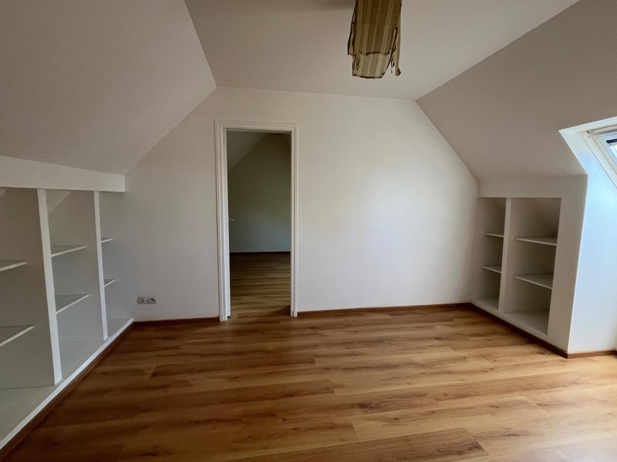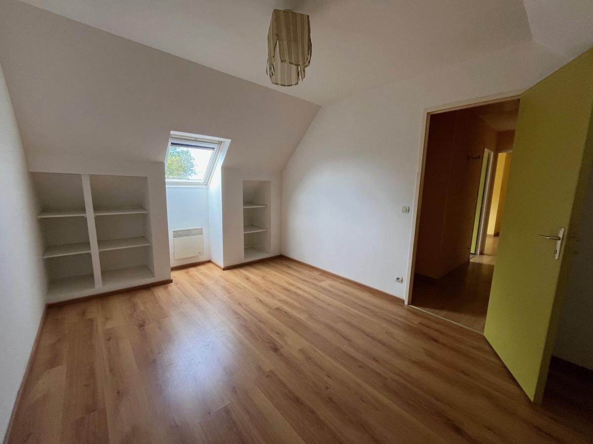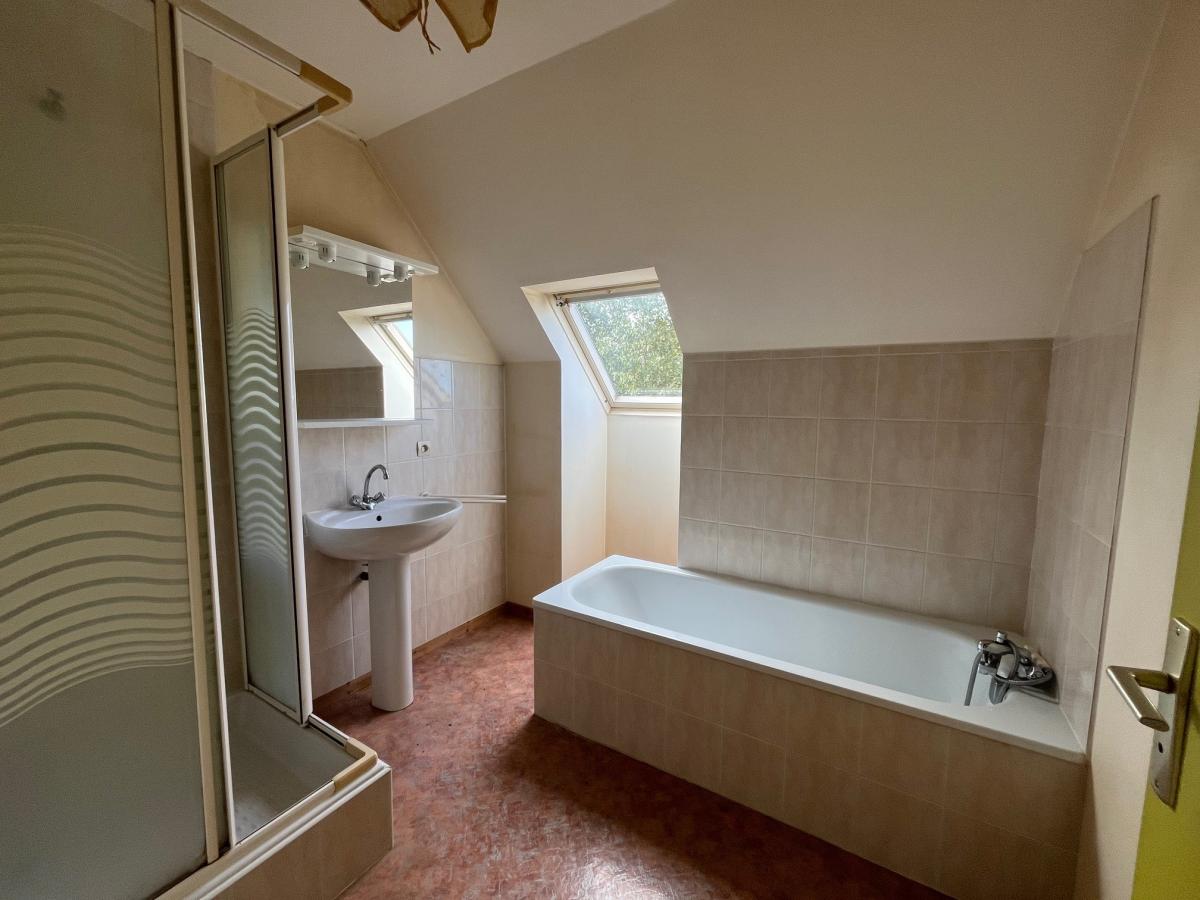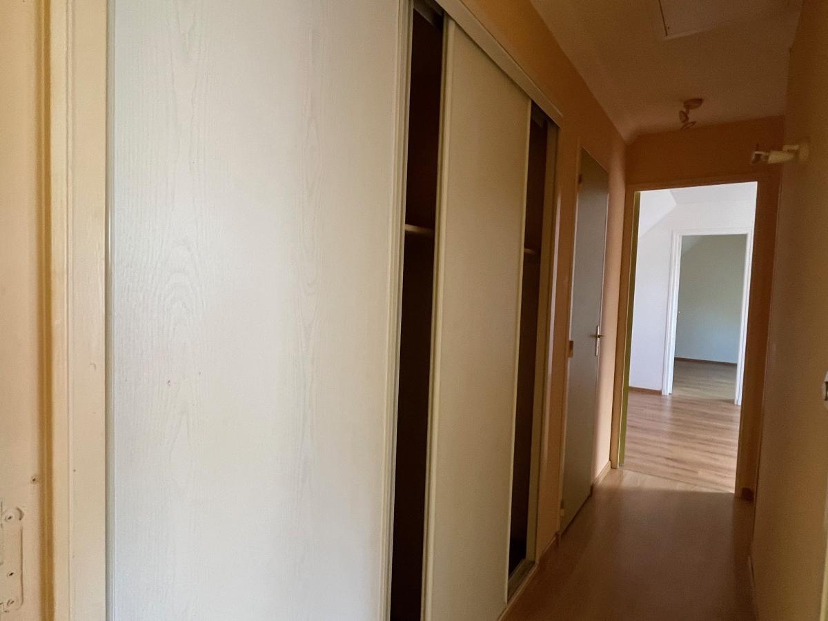 A l'étage : une pièce traversante à usage de bureau, 2 chambres avec rangements, salle de bains, wc. Garage attenant.