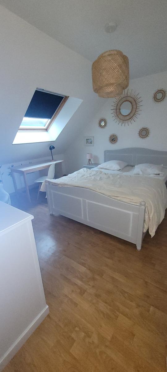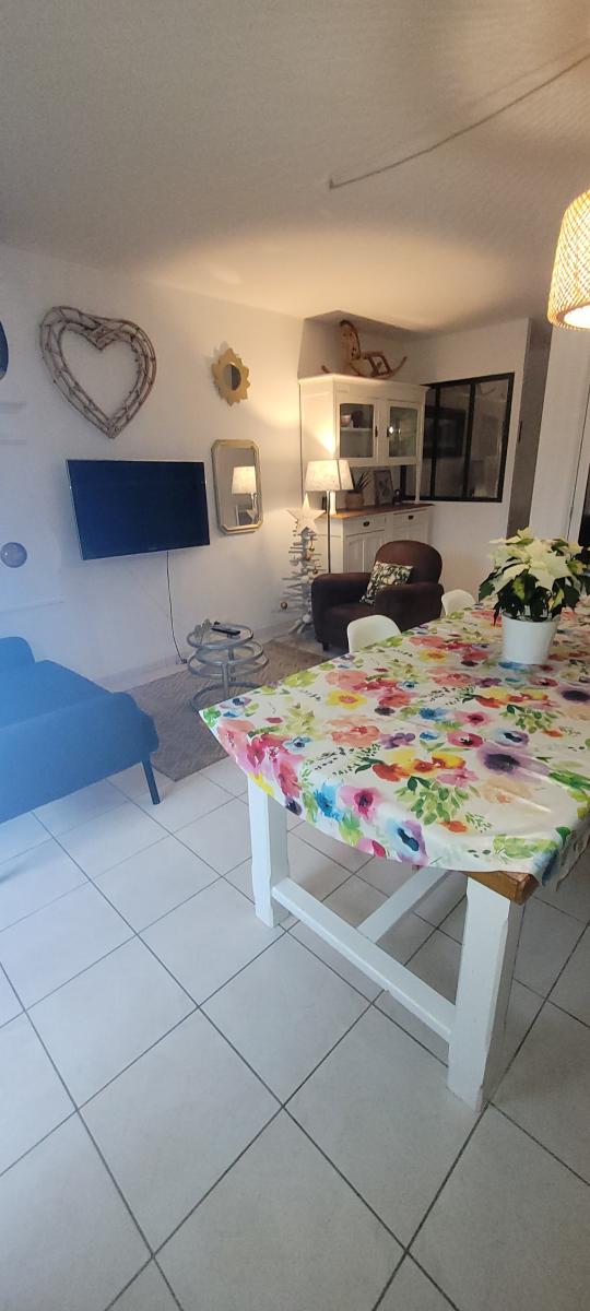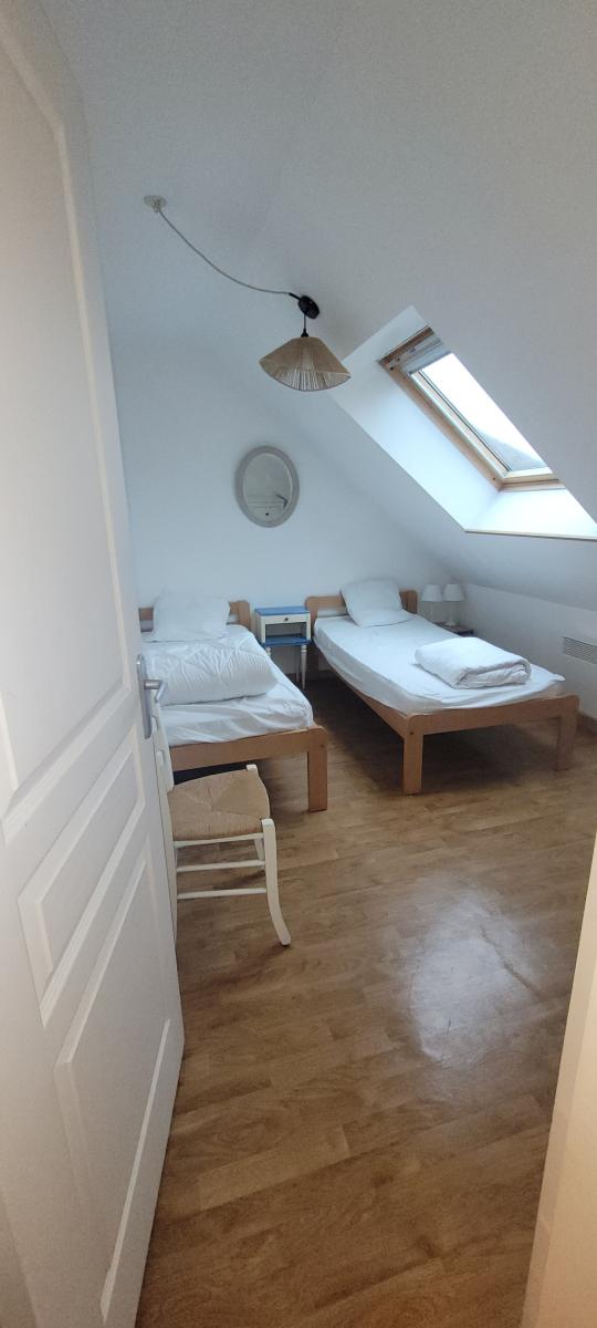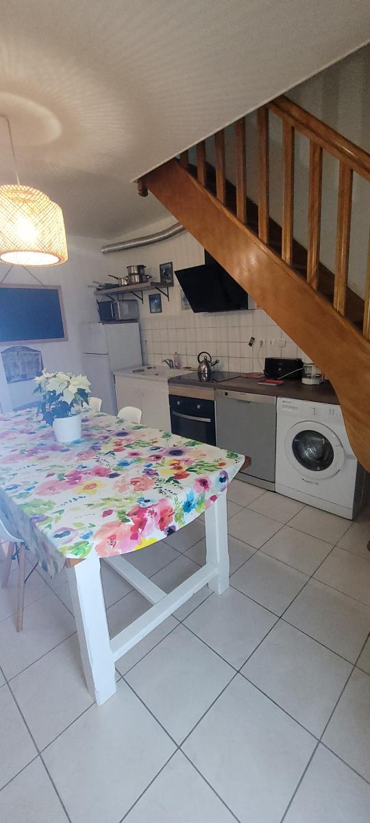 Charmante petite maison mitoyenne, de 46 m², dans le bourg, comprenant une pièce de vie / cuisine équipée, wc, salle d'eau. A l'étage : 2 chambres mansardées, wc. Courette, abri de jardin commun.