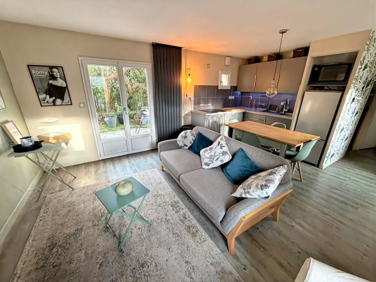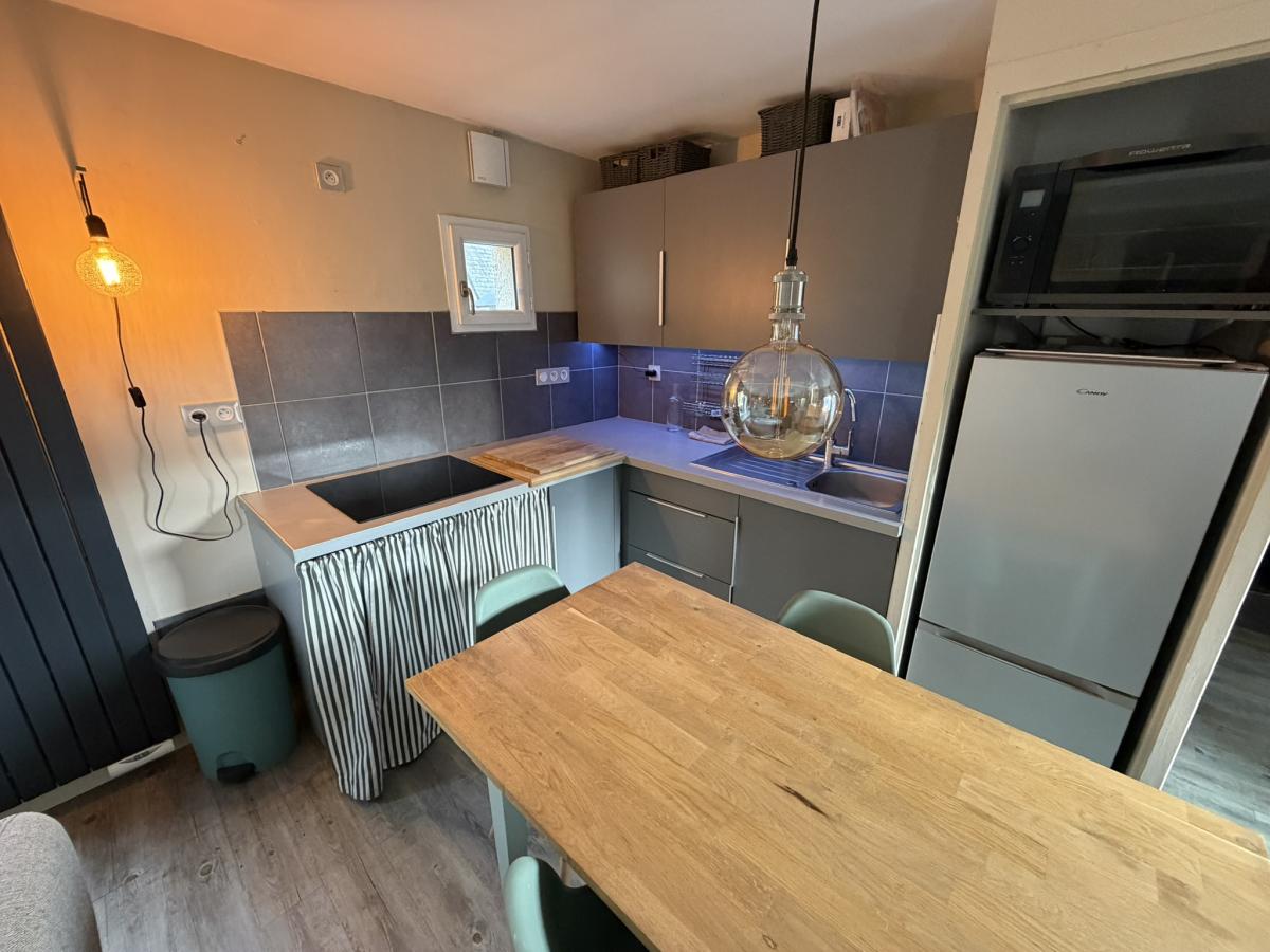 Séjour avec cuisine ouverte équipée, une chambre avec placards, salle d'eau, WC.