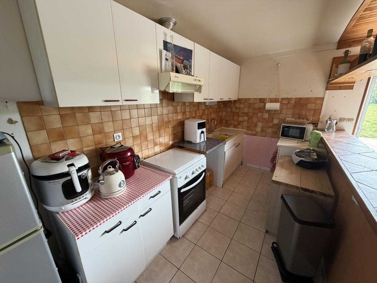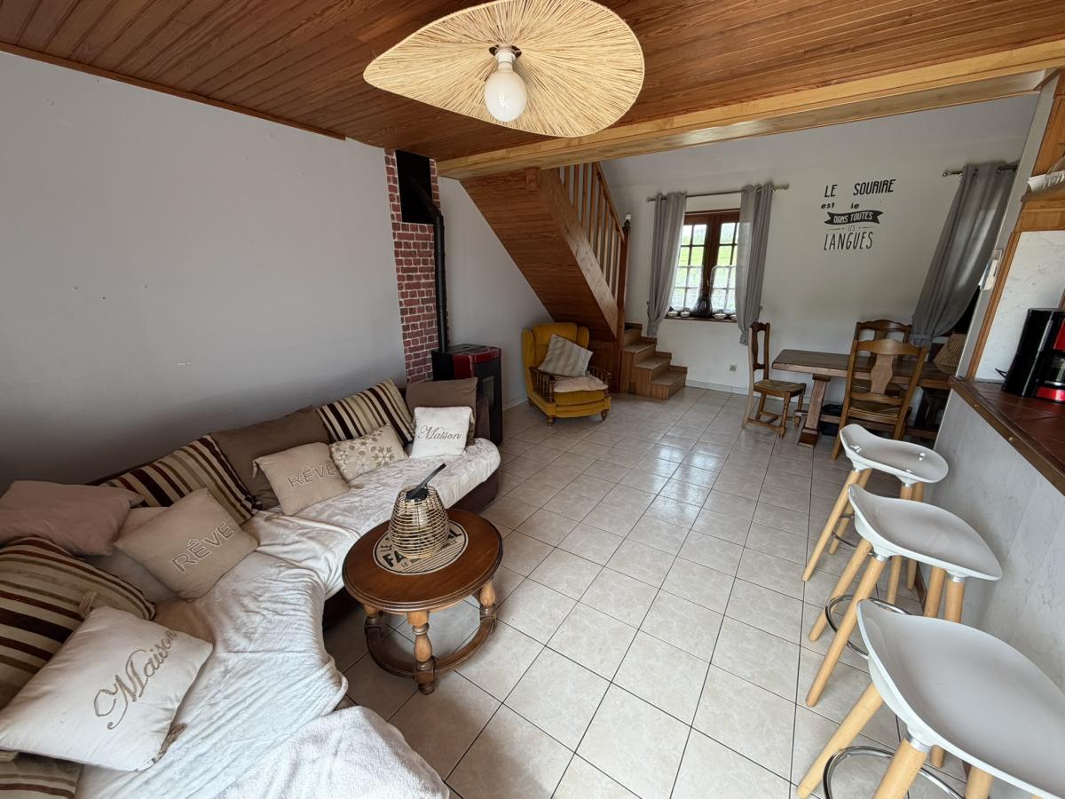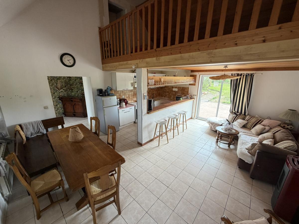 - Au rez de chaussée: entrée, séjour avec poêle à granulés et cuisine ouverte aménagée, WC, salle d'eau deux chambres.