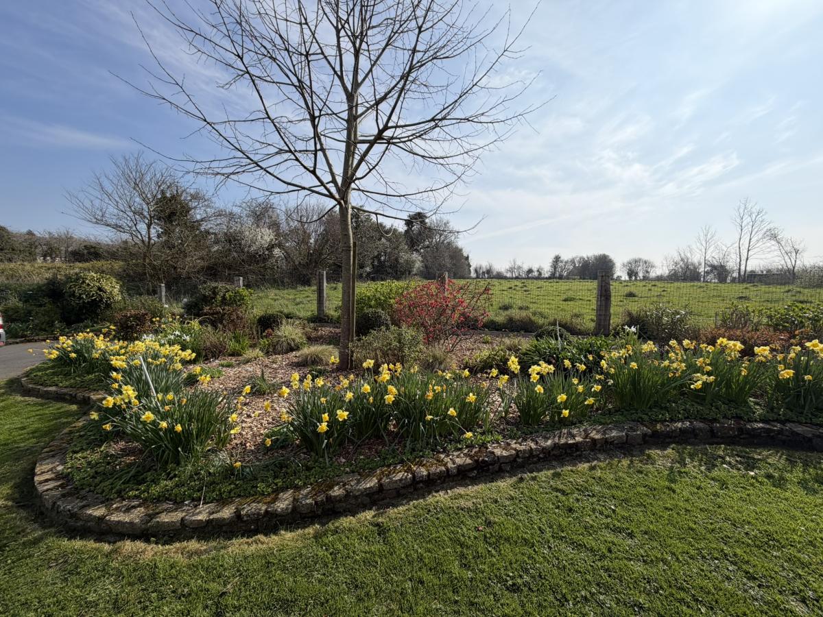Jardin planté sur l’arrière du bâtiment principal avec grande terrasse en bois et stores. Présence d’un robot tondeuse, d’un système d’arrosage, de panneaux solaires et de deux bornes de recharge pour véhicules électriques.