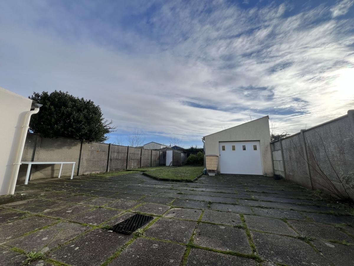 Jardinet à l’avant, garage sur côté, terrasse et jardin à l’arrière avec second garage et cellier.