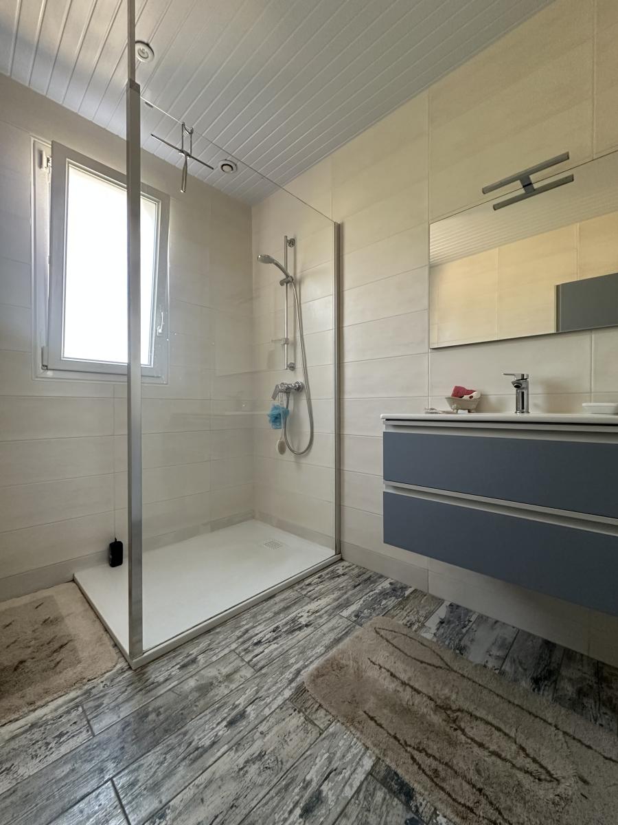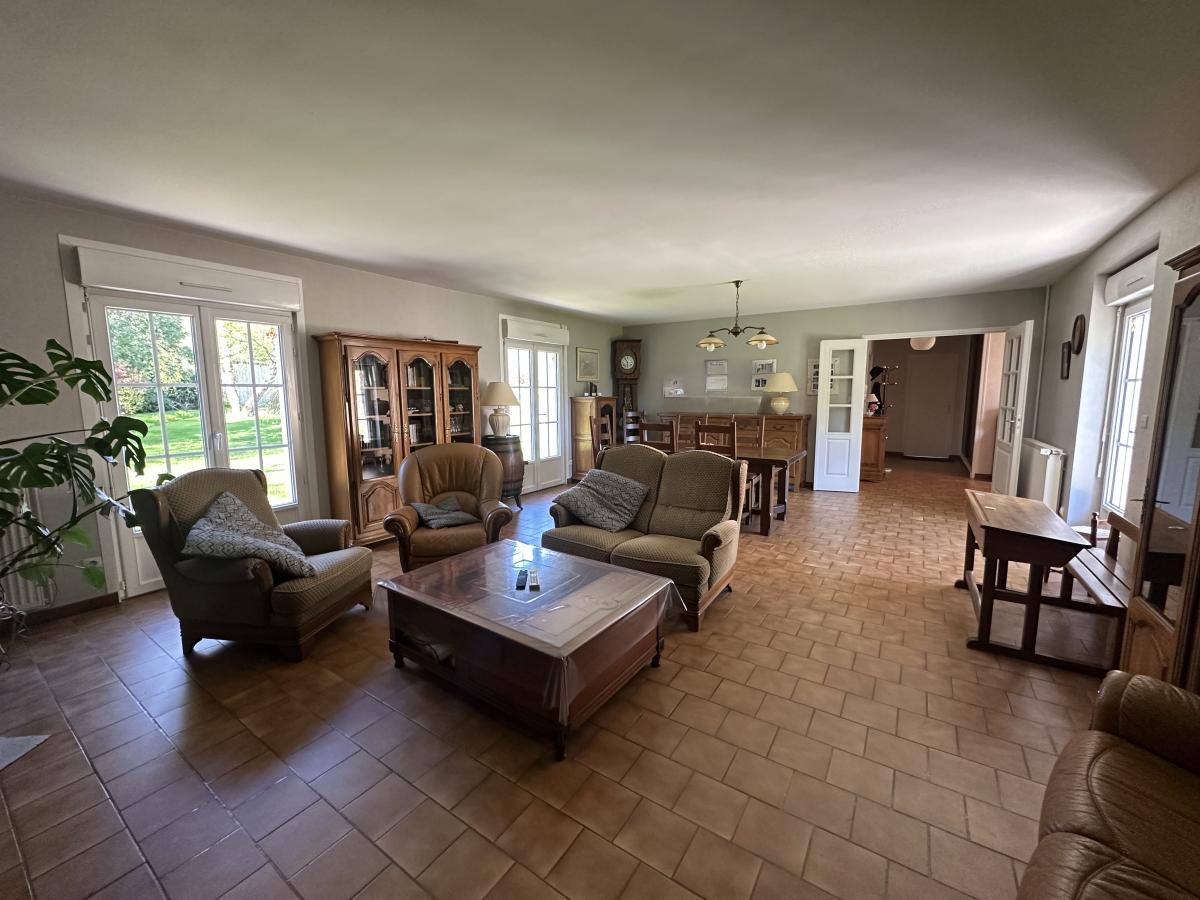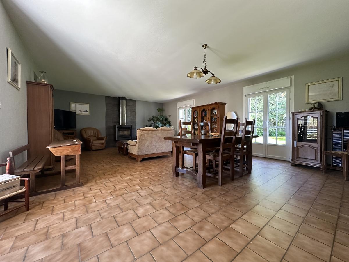 Au rez-de-chaussée : Une vaste entrée avec dégagement et placards, une belle cuisine/salle à manger aménagée et équipée (18m²) + cheminée ouverte, un vaste salon/séjour de 44m² équipée d'un poêle à bois (lumière traversante avec accès aux terrasses des deux côtés), trois chambres dont une avec placards, une salle d'eau refaite en 2025, une seconde salle d'eau (8m²), wc indépendant avec lave-mains.